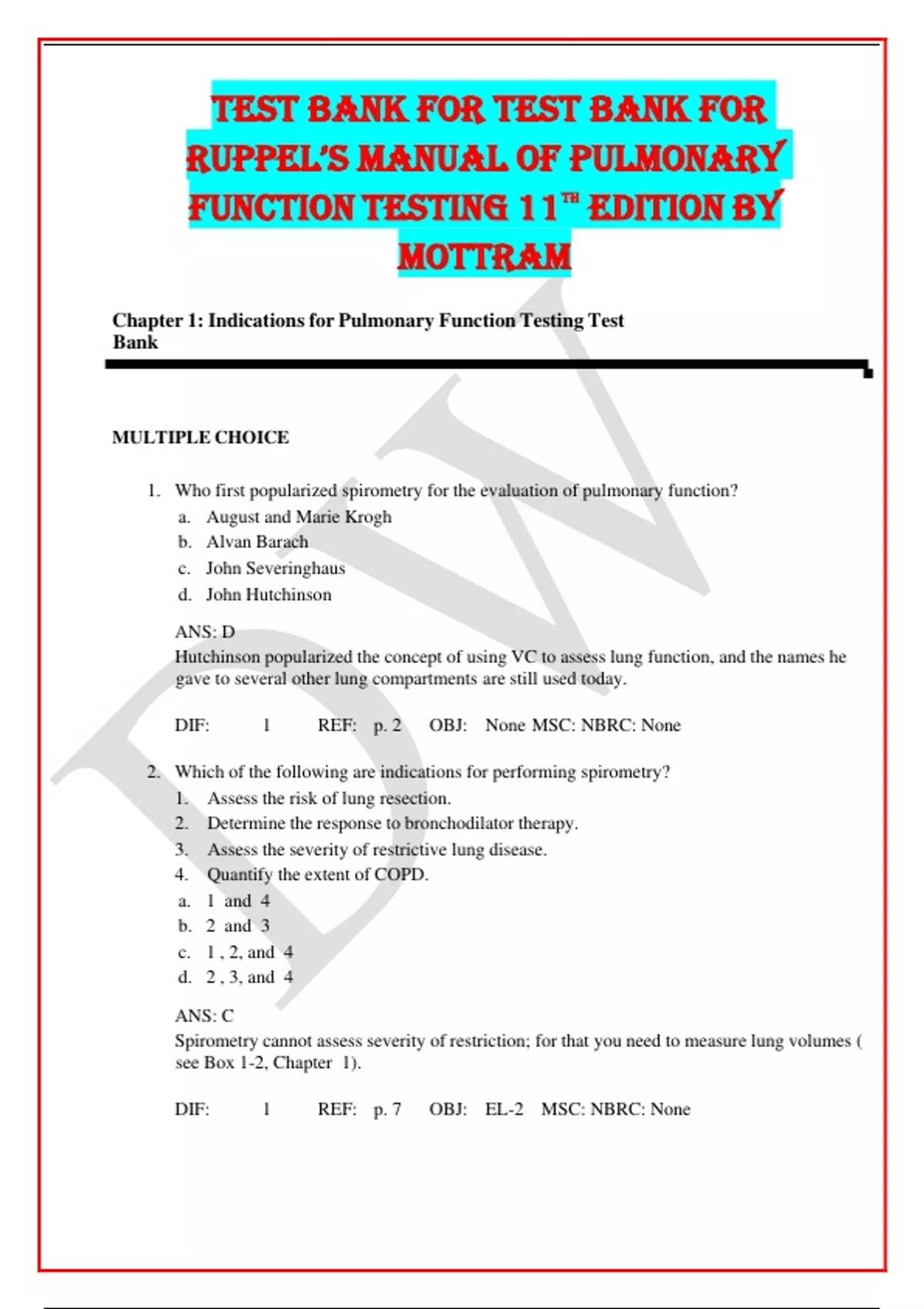 TEST BANK FOR TEST BANK FOR RUPPEL’S MANUAL OF PULMONARY FUNCTION TESTING 11TH EDITION BY CARL MOTTRAM