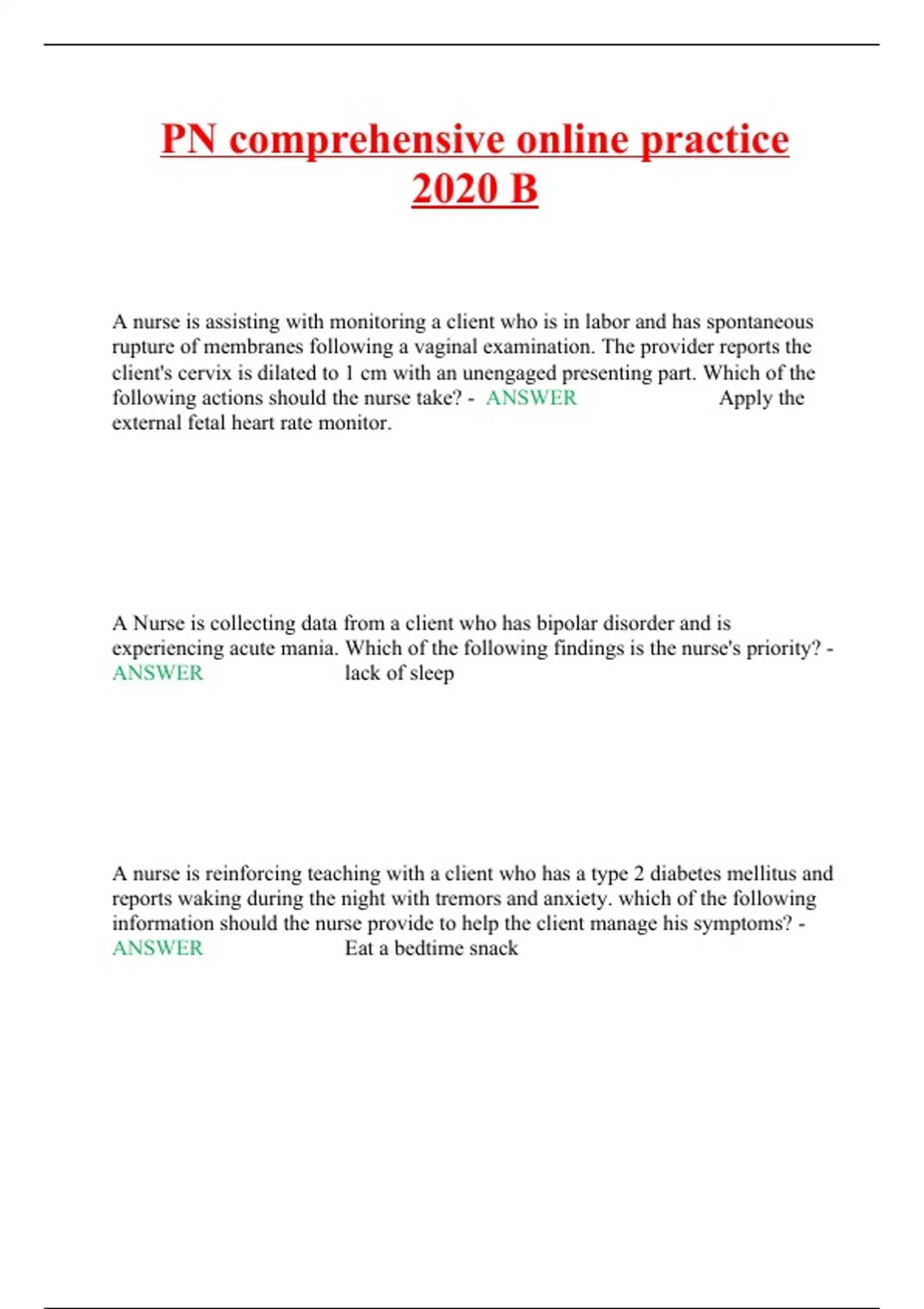 PN comprehensive online practice 2020 B A nurse is assisting with monitoring a client who is in labor and has spontaneous rupture of membranes following a vaginal examination. The provider reports the client's cervix is dilated to 1 cm with an unengaged presenting part. Which of the following actions should the nurse take? - ANSWER Apply the external fetal heart rate monitor. A Nurse is collecting data from a client who has bipolar disorder and is experiencing acute mania. Which of the following findings is the nurse's priority? - ANSWER lack of sleep A nurse is reinforcing teaching with a client who has a type 2 diabetes mellitus and reports waking during the night with tremors and anxiety. which of the following information should the nurse provide to help the client manage his symptoms? - ANSWER Eat a bedtime snack a Nurse is reinforcing teaching for a client who has a coronary artery disease and is taking low-dose aspirin daily. The nurse should include that this medication has which of the following therapeutic effects for CAD? - ANSWER Antiplatelet A nurse is collecting data from a client who has an unprepared femur fracture and rates his pain as 8 on a scale of 0 to 10. The client is talking and caught with a visitor. Which of the following of the prescribed medication should the nurse administer? - ANSWER Hydromorphone 5 mg orally.