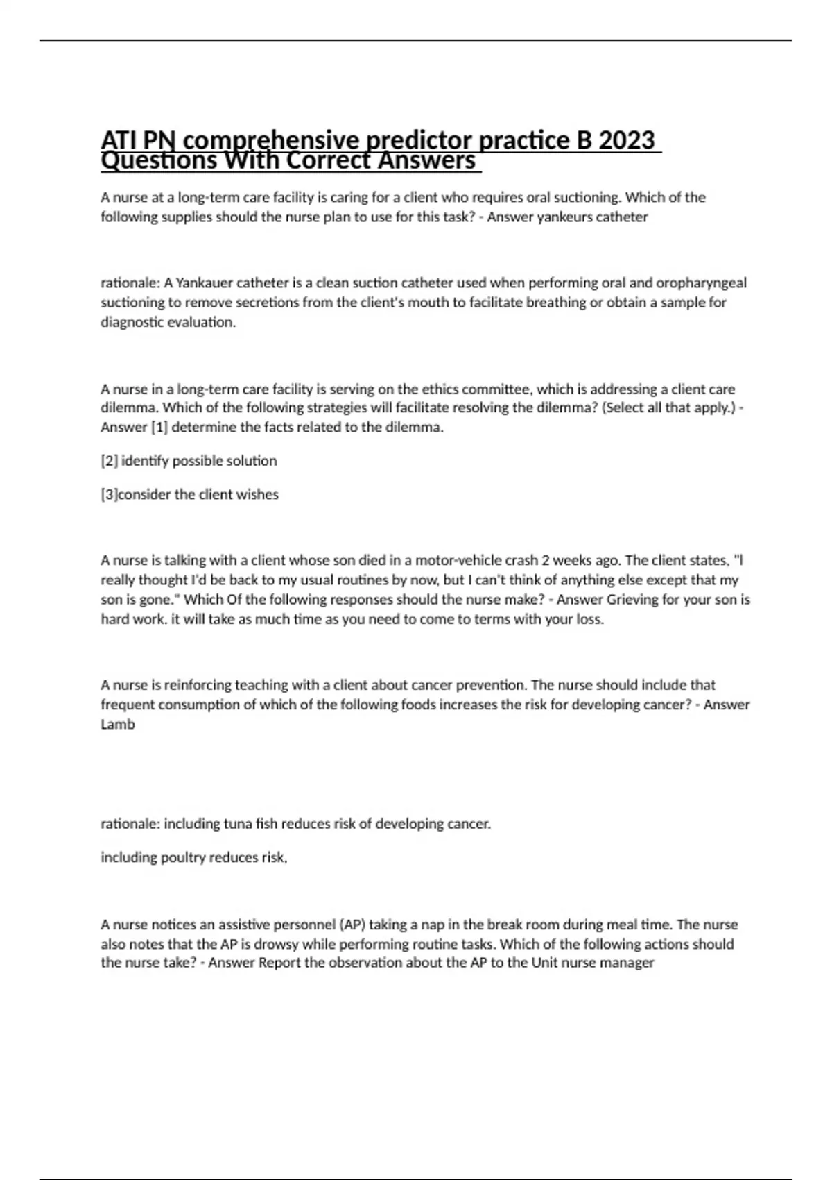 A nurse at a long-term care facility is caring for a client who requires oral suctioning. Which of the following supplies should the nurse plan to use for this task? - Answer yankeurs catheter rationale: A Yankauer catheter is a clean suction catheter used when performing oral and oropharyngeal suctioning to remove secretions from the client's mouth to facilitate breathing or obtain a sample for diagnostic evaluation. A nurse in a long-term care facility is serving on the ethics committee, which is addressing a client care dilemma. Which of the following strategies will facilitate resolving the dilemma? (Select all that apply.) - Answer [1] determine the facts related to the dilemma. [2] identify possible solution [3]consider the client wishes A nurse is talking with a client whose son died in a motor-vehicle crash 2 weeks ago. The client states, "l really thought I'd be back to my usual routines by now, but I can't think of anything else except that my son is gone." Which Of the following responses should the nurse make? - Answer Grieving for your son is hard work. it will take as much time as you need to come to terms with your loss. A nurse is reinforcing teaching with a client about cancer prevention. The nurse should include that frequent consumption of which of the following foods increases the risk for developing cancer? - Answer Lamb rationale: including tuna fish reduces risk of developing cancer. including poultry reduces risk, A nurse notices an assistive personnel (AP) taking a nap in the break room during meal time. The nurse also notes that the AP is drowsy while performing routine tasks. Which of the following actions should the nurse take? - Answer Report the observation about the AP to the Unit nurse manager A nurse on a pediatric unit is collecting data from four newly admitted clients. Which of the following clients should the nurse identify as being at risk for urinary retention? - Answer A school age child who has allergic rhinitis and is taking diphenhydramine. A nurse is caring for a client following a bronchoscopy. Which of the following actions should the nurse take first? - Answer check for gag reflex A nurse is assisting with the admission of a client who has a latex allergy. The nurse should identify that which of the following supplies has the potential to contain latex? - Answer Indwelling urinary catheter A nurse is performing postmortem care for a client prior to the arrival Of the client's family for viewing Of the body. Which Of the following actions should the nurse take? - Answer Gently close the client's eyelids A nurse is reinforcing teaching with a client who has dumping syndrome about measures to reduce manifestations. Which of the following instructions should the nurse include in the teaching? - Answer avoid foods high in sugar content. rationale: The nurse should instruct the client to avoid sweet foods, which often increase the manifestations of dumping syndrome. These manifestations include nausea, sweating, abdominal pain, diarrhea, and weakness. A nurse is collecting data from a client who is experiencing a situational crisis following the loss of a job. The client states, "l don't think I can go through this again." Which of the following actions is the nurse's priority? - Answer Determine if the client is experiencing psychotic thinking. A nurse is contributing to the plan of care for a client following a transurethral resection of the prostate (TURP). Which of the following interventions should the nurse include? - Answer Irrigate the bladder using sterile technique A nurse is caring for an infant who is receiving IV fluids for dehydration. Which of the following should the nurse recognize as a positive response to the therapy? - Answer Moist mucus membranes. A nurse is assisting with the admission of a client who is experiencing alcohol withdrawal. Which of the following medications should the nurse expect the provider to prescribe for the client? - Answer Chlordiazepoxide rationale: The nurse should expect to administer chlordiazepoxide to decrease anxiety and the risk for seizures associated with alcohol withdrawal. A nurse is caring for a client who is scheduled for surgery in the morning. The nurse learns that the client has decided not to have surgery even though they have already signed the informed consent form. Which of the following actions should the nurse take? - Answer report the situation to the provider who obtained informed consent. A nurse is collecting data from a client who is in severe pain. Which of the following questions should the nurse ask first? - Answer where is your pain located A nurse in a provider's office is reinforcing teaching with a client who has a new prescription for ferrous sulfate elixir. Which of the following statements by the client should indicate to the nurse an understanding of the teaching? - Answer i will rinse my mouth after taking this medication A nurse is contributing to the plan of care for a client who is postoperative following a rhinoplasty. Which of the following interventions should the nurse recommend? - Answer instruct the client to avoid the Valsalva maneuver. rationale. Valsalva ts such as straining during defecation or playing the saxophone entail performance of Valsalva maneuver A nurse is collecting data from a postpartum client who had a vaginal birth 2 days ago. Which Of the following findings is the nurse's priority to report to the provider? - Answer client reports burning with urination. rationale: When using the urgent vs. nonurgent approach to client care, the nurse should determine that dysuria is a manifestation of a urinary tract infection. Therefore, the nurse should identify this as the priority finding to report to the provider. A nurse is preparing to administer digoxin to a client who has heart failure. Which Of the following findings should indicate to the nurse that the medication has been effective? - Answer cardiac workload decreases A nurse is reinforcing