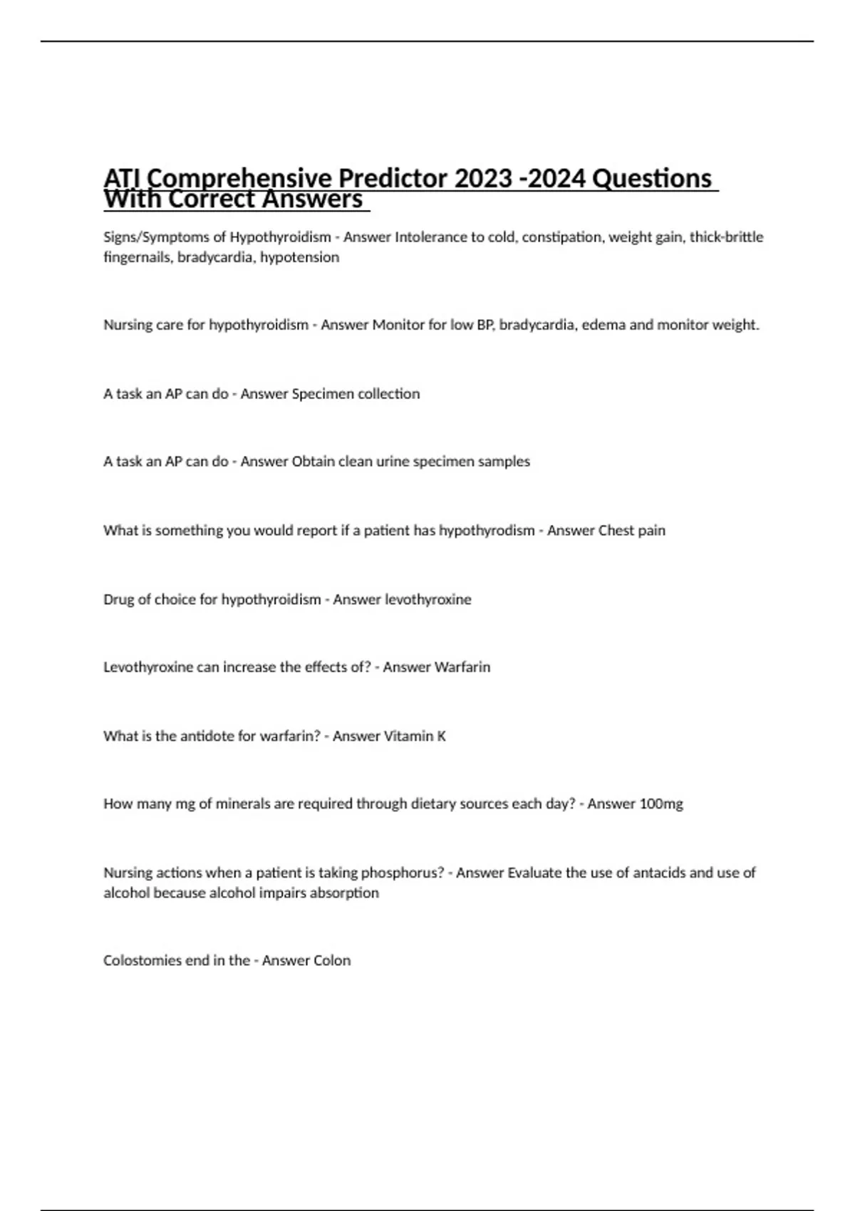ATI Comprehensive Predictor Questions With Correct Answers