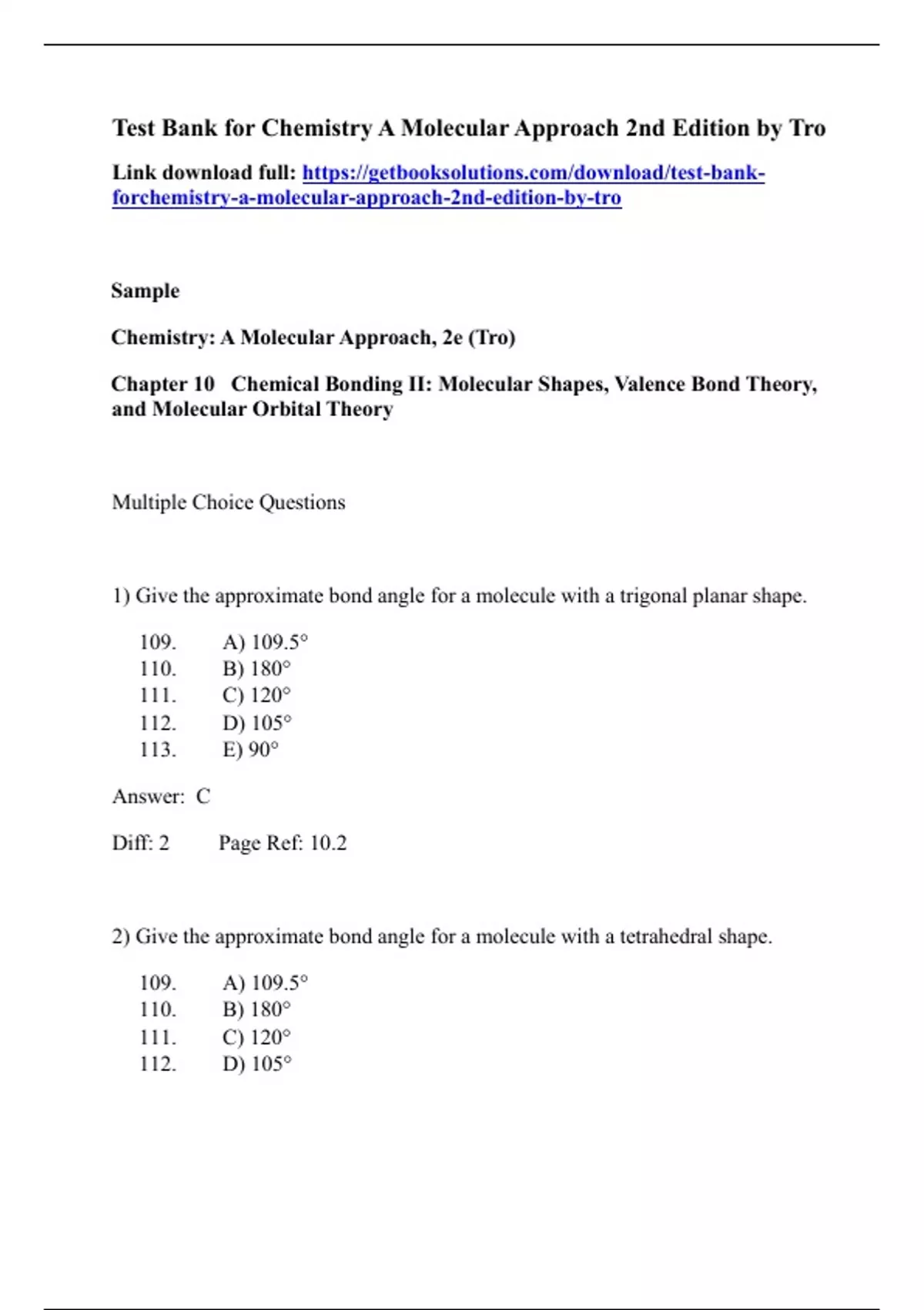 Test Bank for Chemistry A Molecular Approach 2nd Edition by Tro Chapter 10 Chemical Bonding II Molecular Shapes, Valence Bond Theory, and Molecular Orbital Theory