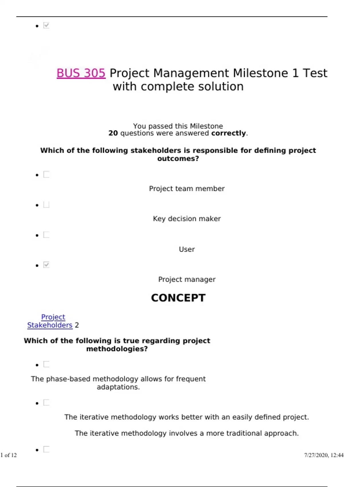 Project Management Milestone 1 test 2023 with complete solution