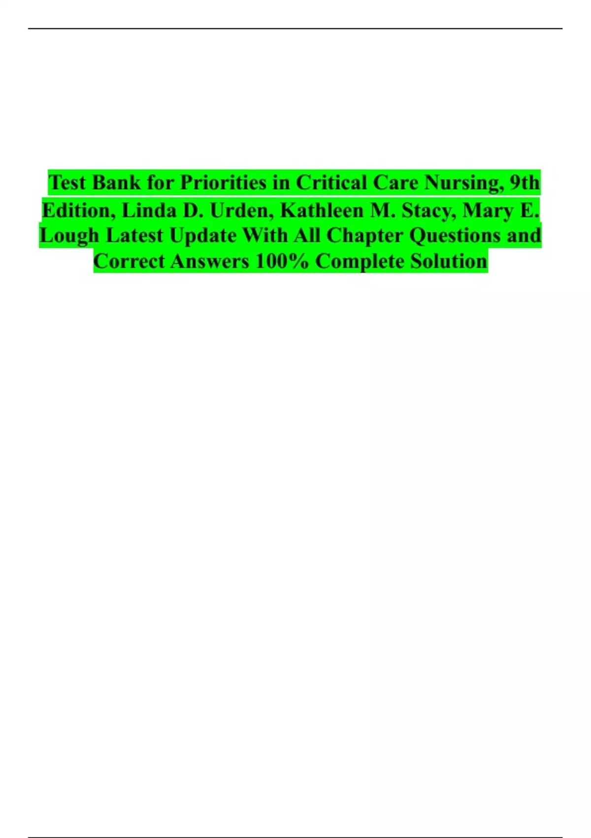 Test Bank for Priorities in Critical Care Nursing, 9th Edition, Linda D. Urden, Kathleen M. Stacy, Mary E. Lough Latest Update With All Chapter Questions and Correct Answers 100% Complete Solution
