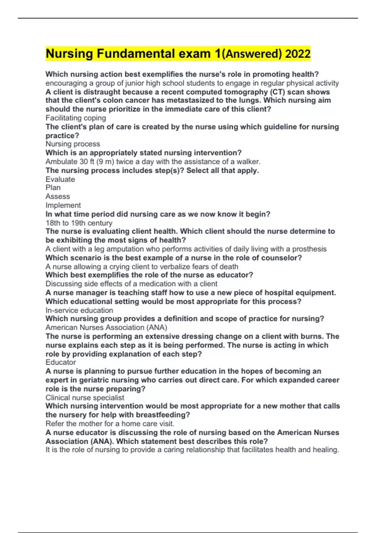 Which nursing action best exemplifies the nurse's role in promoting health? encouraging a group of junior high school students to engage in regular physical activity A client is distraught because a recent computed tomography (CT) scan shows that the client's colon cancer has metastasized to the lungs. Which nursing aim should the nurse prioritize in the immediate care of this client? Facilitating coping The client's plan of care is created by the nurse using which guideline for nursing practice? Nursing process Which is an appropriately stated nursing intervention? Ambulate 30 ft (9 m) twice a day with the assistance of a walker. The nursing process includes step(s)? Select all that apply. Evaluate Plan Assess Implement In what time period did nursing care as we now know it begin? 18th to 19th century The nurse is evaluating