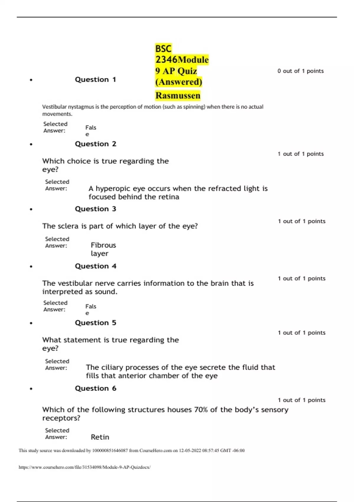 BSC 2346Module 9 AP Quiz (Answered) Rasmusse