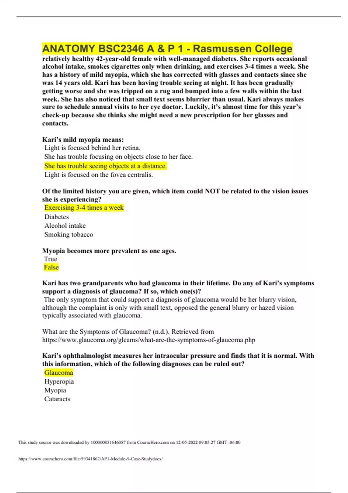 ly healthy 42-year-old female with well-managed diabetes. She reports occasional alcohol intake, smokes cigarettes only when drinking, and exercises 3-4 times a week. She has a history of mild myopia, which she has corrected with glasses and contacts since she was 14 years old. Kari has been having trouble seeing at night. It has been gradually getting worse and she was tripped on a rug and bumped into a few walls within the last week. She has also noticed that small text seems blurrier than usual. Kari always makes sure to schedule annual visits to her eye doctor. Luckily, it’s almost time for this year’s check-up because she thinks she might need a new prescription for her glasses and contacts. Kari’s mild myopia means: Light is focused behind her retina. She has trouble focusing on objects close to her face. She has trouble seeing objects at a distance. Light is focused on the fovea centralis.