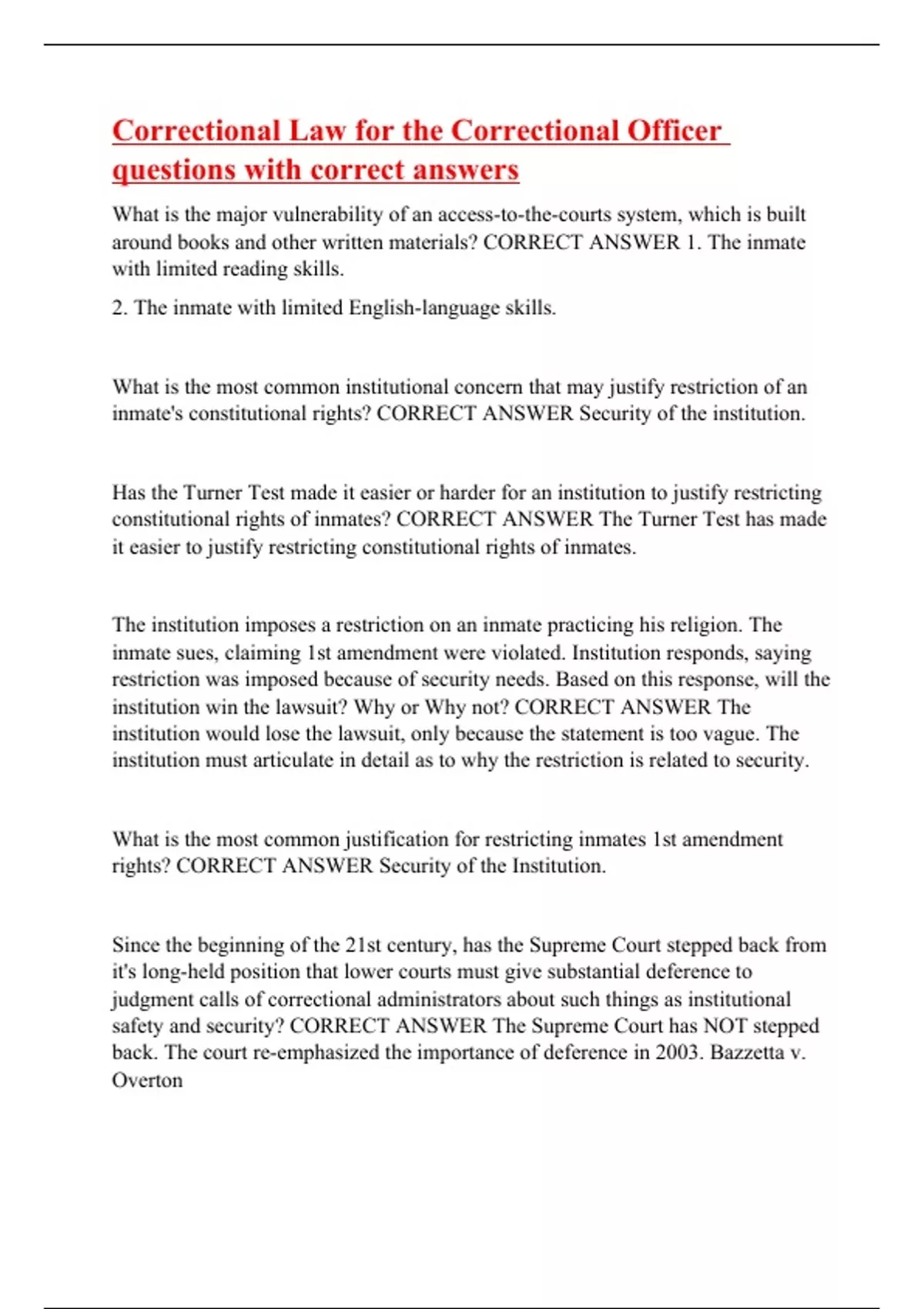 What is the major vulnerability of an access-to-the-courts system, which is built around books and other written materials? CORRECT ANSWER 1. The inmate with limited reading skills. 2. The inmate with limited English-language skills. What is the most common institutional concern that may justify restriction of an inmate's constitutional rights? CORRECT ANSWER Security of the institution. Has the Turner Test made it easier or harder for an institution to justify restricting constitutional rights of inmates? CORRECT ANSWER The Turner Test has made it easier to justify restricting constitutional rights of inmates. The institution imposes a restriction on an inmate practicing his religion. The inmate sues, claiming 1st amendment were violated. Institution responds, saying restriction was imposed because of security needs. Based on this response, will the institution win the lawsuit? Why or Why not? CORRECT ANSWER The institution would lose the lawsuit, only because the statement is too vague. The institution must articulate in detail as to why the restriction is related to security. What is the most common justification for restricting inmates 1st amendment rights? CORRECT ANSWER Security of the Institution.