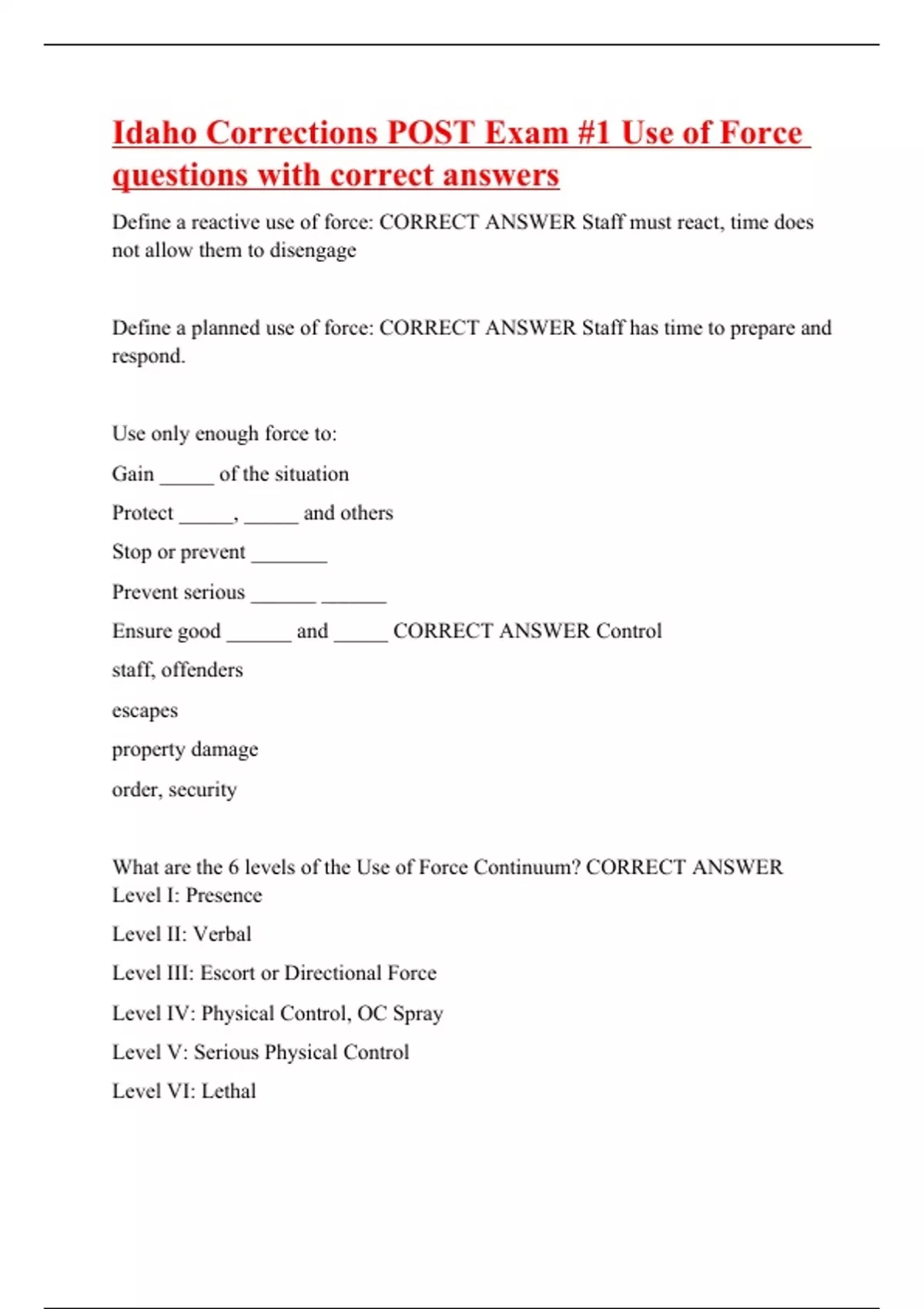 Define a reactive use of force: CORRECT ANSWER Staff must react, time does not allow them to disengage Define a planned use of force: CORRECT ANSWER Staff has time to prepare and respond. Use only enough force to: Gain _____ of the situation Protect _____, _____ and others Stop or prevent _______ Prevent serious ______ ______ Ensure good ______ and _____ CORRECT ANSWER Control staff, offenders escapes property damage order, security What are the 6 levels of the Use of Force Continuum? CORRECT ANSWER Level I: Presence Level II: Verbal Level III: Escort or Directional Force Level IV: Physical Control, OC Spray Level V: Serious Physical Control Level VI: Lethal
