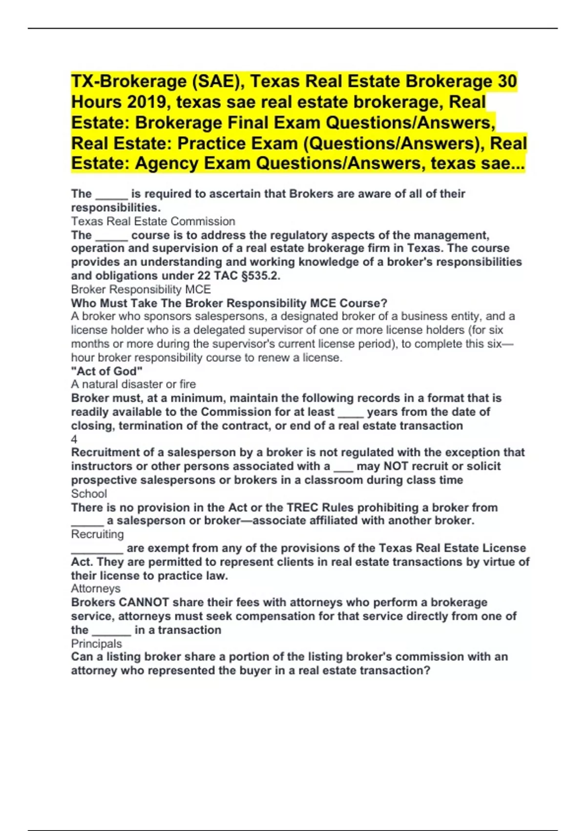 TX-Brokerage (SAE), Texas Real Estate Brokerage 30 Hours 2019, texas sae real estate brokerage, Real Estate: Brokerage Final Exam Questions/Answers, Real Estate: Practice Exam (Questions/Answers), Real Estate: Agency Exam Questions/Answers, texas sae...