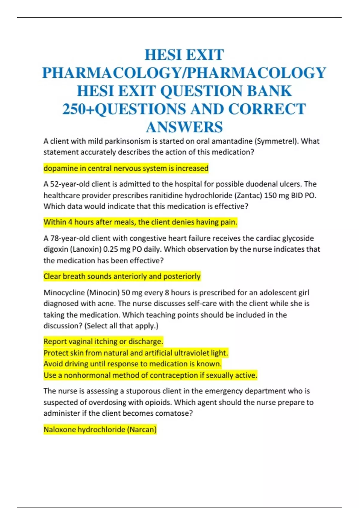 HESI EXIT PHARMACOLOGY/PHARMACOLOGY HESI EXIT QUESTION BANK 250+QUESTIONS AND CORRECT ANSWERS