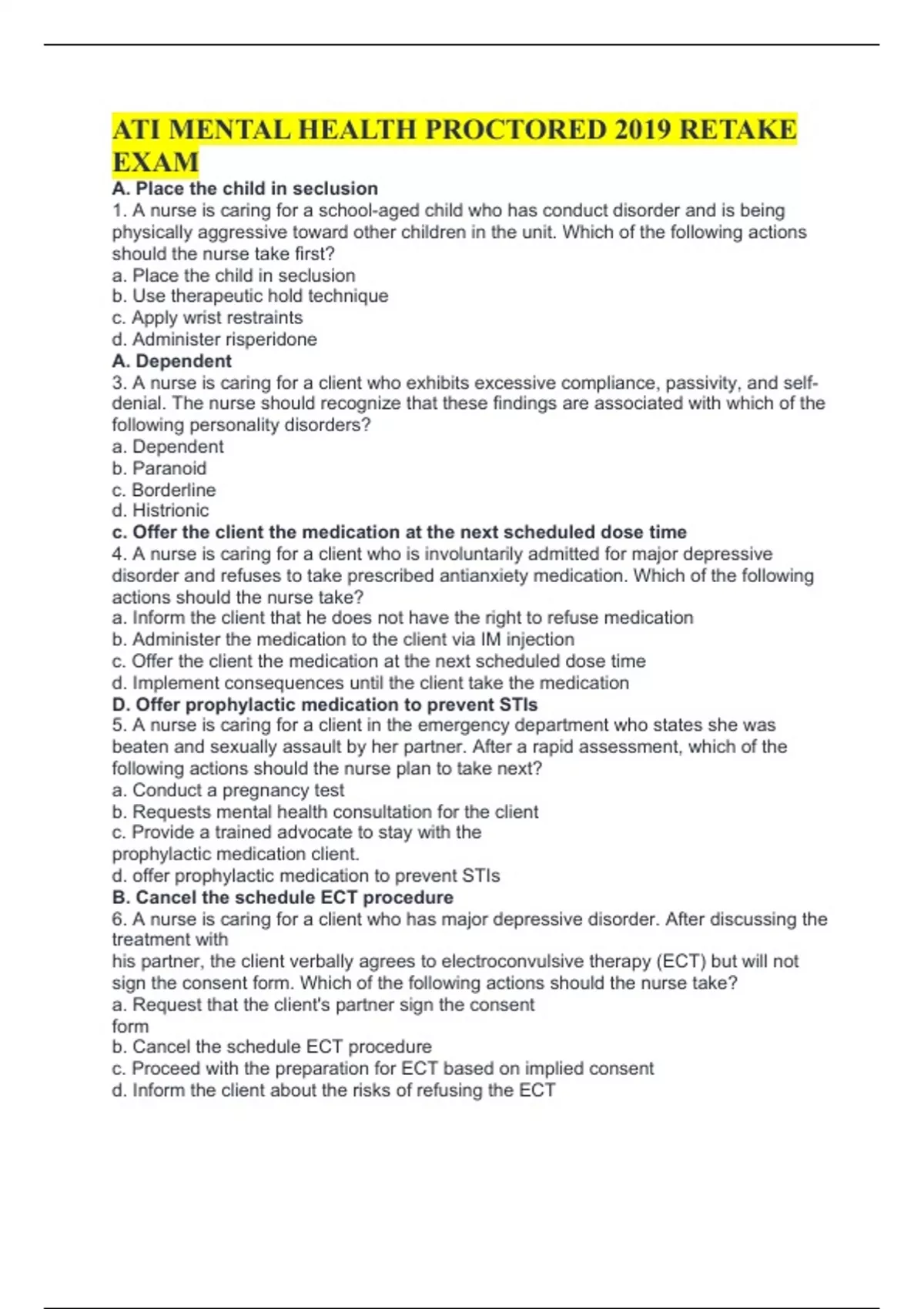 ATI MENTAL HEALTH PROCTORED 2019 RETAKE EXAM A. Place the child in seclusion 1. A nurse is caring for a school-aged child who has conduct disorder and is being physically aggressive toward other children in the unit. Which of the following actions should the nurse take first? a. Place the child in seclusion b. Use therapeutic hold technique c. Apply wrist restraints d. Administer risperidone A. Dependent 3. A nurse is caring for a client who exhibits excessive compliance, passivity, and self-denial. The nurse should recognize that these findings are associated with which of the following personality disorders? a. Dependent b. Paranoid c. Borderline d. Histrionic c. Offer the client the medication at the next scheduled dose time 4. A nurse is caring for a client who is involuntarily admitted for major depressive disorder and refuses to take prescribed antianxiety medication. Which of the following actions should the nurse take? a. Inform the client that he does not have the right to refuse medication b. Administer the medication to the client via IM injection c. Offer the client the medication at the next scheduled dose time d. Implement consequences until the client take the medication D. Offer prophylactic medication to prevent STIs 5. A nurse is caring for a client in the emergency department who states she was beaten and sexually assault by her partner. After a rapid assessment, which of the following actions should the nurse plan to take next? a. Conduct a pregnancy test b. Requests mental health consultation for the client c. Provide a trained advocate to stay with the prophylactic medication client. d. offer prophylactic medication to prevent STIs B. Cancel the schedule ECT procedure 6. A nurse is caring for a client who has major depressive disorder. After discussing the treatment with his partner, the client verbally agrees to electroconvulsive therapy (ECT) but will not sign the consent form. Which of the following actions should the nurse take? a. Request that the client's partner sign the consent form b. Cancel the schedule ECT procedure c. Proceed with the preparation for ECT based on implied consent d. Inform the client about the risks of refusing the ECT d. Displacement 7. A nurse is caring for a client who reports that he is angry with his partner because she thinks he is just trying to gain attention. When the nurse attempts to talk to the client, he becomes angry and tells her to leave. Which of the following defense mechanisms is the client demonstrating? a. Rationalization b. Denial c. Compensation d. Displacement b. It's important that the client feel safe verbalizing how she is feeling 8. A nursing is advising an assistive personnel (AP) on the care of a client who has major depressive disorder. The AP states that he is irritated by the client's depression. Which of the following statements by the nurse is appropriate? a. Please don't take what the client said seriously when she is depressed b. It's important that the client feel safe verbalizing how she is feeling c. Everybody feels that way about this client so don't worry about it d. I'll change your assignment to someone who doesn't have depressive disorder d. The child has cystic fibrosis 9. A nurse is assessing a child in the emergency department. Which of the following findings places the child at the greatest risk for physical abuse? a. The child is 10years old b. The child is homeschooled c. The has no siblings d. The child has cystic fibrosis b. Snap a rubber band on your wrist when you think about checking the locks 10. A nurse Is providing behavioral therapy for a client who has obsessive-compulsive disorder.The client repeatedly checks that the doors are locked at night. Which of the following instructions should the nurse give the client when using thought stopping technique? a. Keep a journal of how often you check the locks each night b. Snap a rubber band on your wrist when you think about checking the locks c. Ask a family member to check the lock for you at night d. Focus on abdominal breathing whenever you go to check the locks a. Bradycardia 11. A nurse is assessing a client who is experiencing alcohol withdrawal.For which of the following findings should the nurse anticipate administration of lorazepam/ a. Bradycardia b. Stupor c. Afebrile d. Hypertension d. Encourage the client to participate in family therapy 12. A nurse is creating a plan of care of a client who has anorexia nervosa.Which of the following intervention should the nurse include in the plan? a. Weigh the client twice per day b. Prepare the client for electroconvulsive therapy