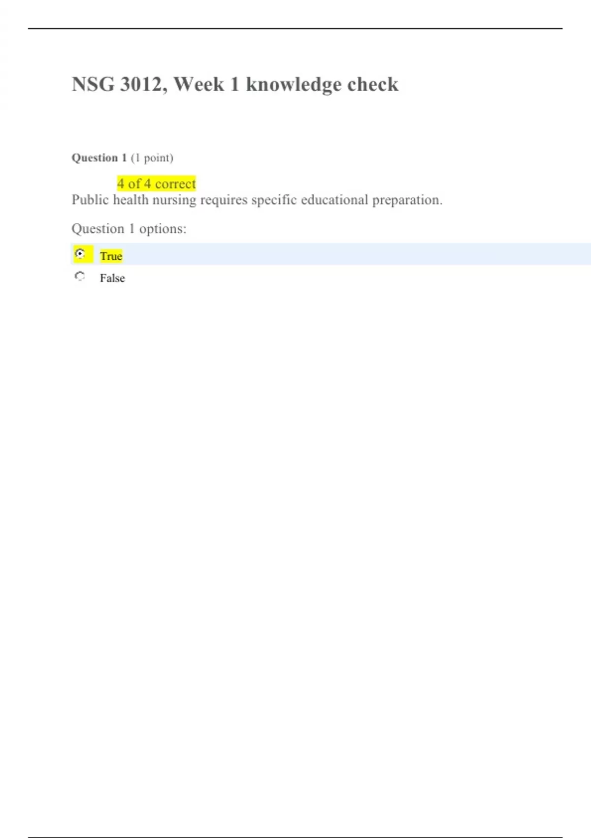 NSG 3012 Week 1 knowledge Check (Version 1), NSG 3012: PRINCIPLES OF ASSESSMENT. NSG 3012, Week 1 knowledge check Question 1 (1 point) 4 of 4 correct Public health nursing requires specific educational preparation. Question 1 options: True False Question 2 (1 point) The World Health Organization's (WHO) main goal is to build a better, healthier future for people all over the world. Question 2 options: True False Save Next Page Question 3 (1 point) Community nurses must be aware of the influence of government, law, and health policy on nursing on those communities in which they operate. Question 3 options: True False Question 4 (1 point) Socioeconomic status does NOT affect an individual’s health status. Question 4 options: True False