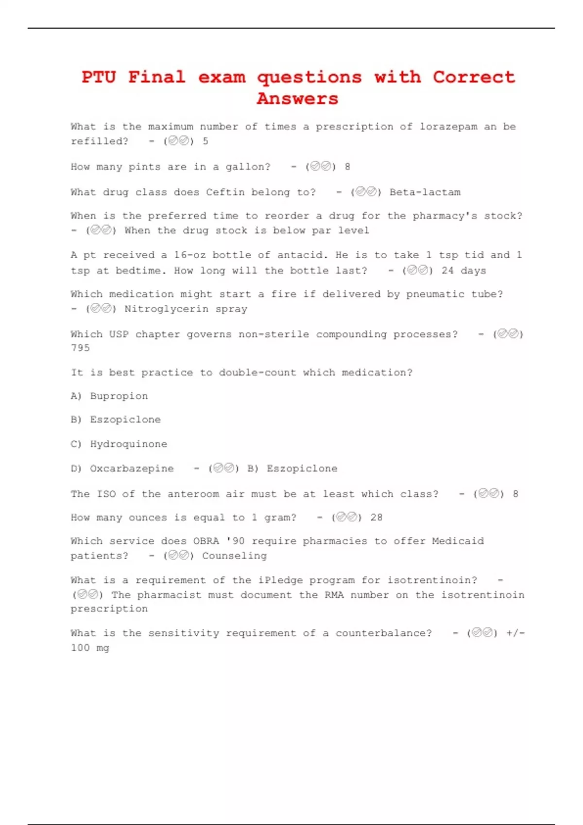 PTU Final exam questions with Correct Answers What is the maximum number of times a prescription of lorazepam an be refilled? - () 5