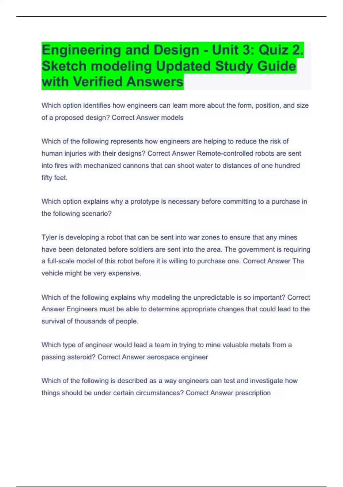 Engineering and Design - Unit 3: Quiz 2. Sketch modeling Updated Study Guide with Verified Answers Which option identifies how engineers can learn more about the form, position, and size of a proposed design? Correct Answer models Which of the following represents how engineers are helping to reduce the risk of human injuries with their designs? Correct Answer Remote-controlled robots are sent into fires with mechanized cannons that can shoot water to distances of one hundred fifty feet. Which option explains why a prototype is necessary before committing to a purchase in the following scenario? Tyler is developing a robot that can be sent into war zones to ensure that any mines have been detonated before soldiers are sent into the area. The government is requiring a full-scale model of this robot before it is willing to purchase one. Correct Answer The vehicle might be very expensive. Which of the following explains why modeling the unpredictable is so important? Correct Answer Engineers must be able to determine appropriate changes that could lead to the survival of thousands of people. Which type of engineer would lead a team in trying to mine valuable metals from a passing asteroid? Correct Answer aerospace engineer Which of the following is described as a way engineers can test and investigate how things should be under certain circumstances? Correct Answer prescription Which of the following fields allows individuals to explore their creativity and ingenuity by devising new ways to think about everyday objects? Correct Answer engineering Which of the following degrees is needed to become a geological engineer? Correct Answer bachelor's degree in mining engineering In no less than one hundred fifty words, explain three reasons why an engineer would choose to use a prototEngineering and Design - Unit 3: Quiz 2. Sketch modeling Updated Study Guide with Verified Answers Which option identifies how engineers can learn more about the form, position, and size of a proposed design? Correct Answer models Which of the following represents how engineers are helping to reduce the risk of human injuries with their designs? Correct Answer Remote-controlled robots are sent into fires with mechanized cannons that can shoot water to distances of one hundred fifty feet. Which option explains why a prototype is necessary before committing to a purchase in the following scenario? Tyler is developing a robot that can be sent into war zones to ensure that any mines have been detonated before soldiers are sent into the area. The government is requiring a full-scale model of this robot before it is willing to purchase one. Correct Answer The vehicle might be very expensive. Which of the following explains why modeling the unpredictable is so important? Correct Answer Engineers must be able to determine appropriate changes that could lead to the survival of thousands of people. Which type of engineer would lead a team in trying to mine valuable metals from a passing asteroid? Correct Answer aerospace engineer Which of the following is described as a way engineers can test and investigate how things should be under certain circumstances? Correct Answer prescription Which of the following fields allows individuals to explore their creativity and ingenuity by devising new ways to think about everyday objects? Correct Answer engineering Which of the following degrees is needed to become a geological engineer? Correct Answer bachelor's degree in mining engineering In no less than one hundred fifty words, explain three reasons why an engineer would choose to use a prototype as his or her model on a design project. Correct Answer The first reason why an engineer would choose to use a prototype as his or her model on a design project is that prototypes help engineers can test out their product mobility and if it functions as described. The second reason why an engineer would choose to use a prototype as his or her model on a design project is that prototypes can show the employer and the engineer how aesthetically pleasing the prototype will be. The third reason why an engineer would choose to use a prototype as his or her model on a ype as his or her model on a design project. Correct Answer The first reason why an engineer would choose to use a prototype as his or her model on a
