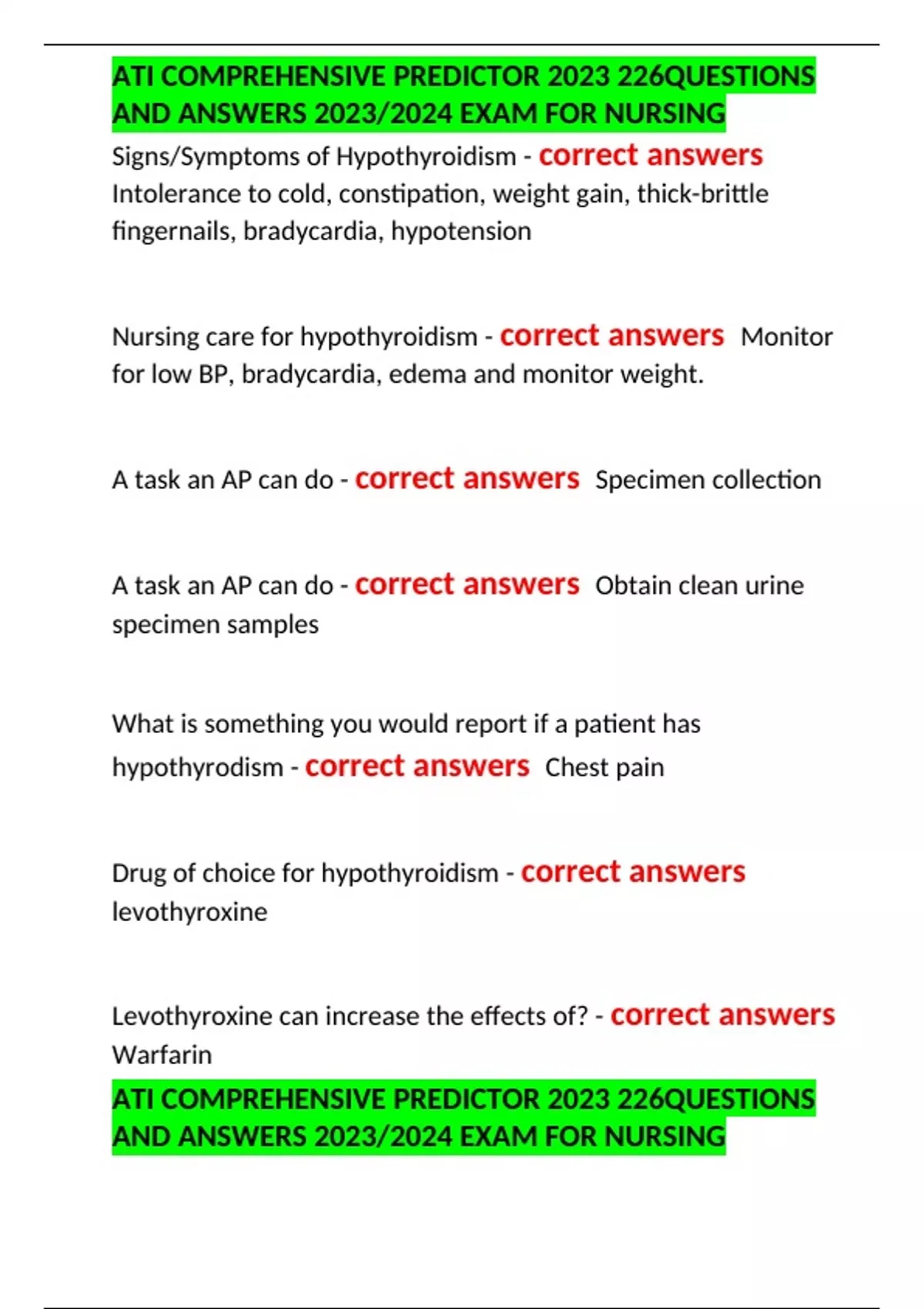 ATI COMPREHENSIVE PREDICTOR 2023 226QUESTIONS AND ANSWERS 2023/2024 EXAM FOR NURSING