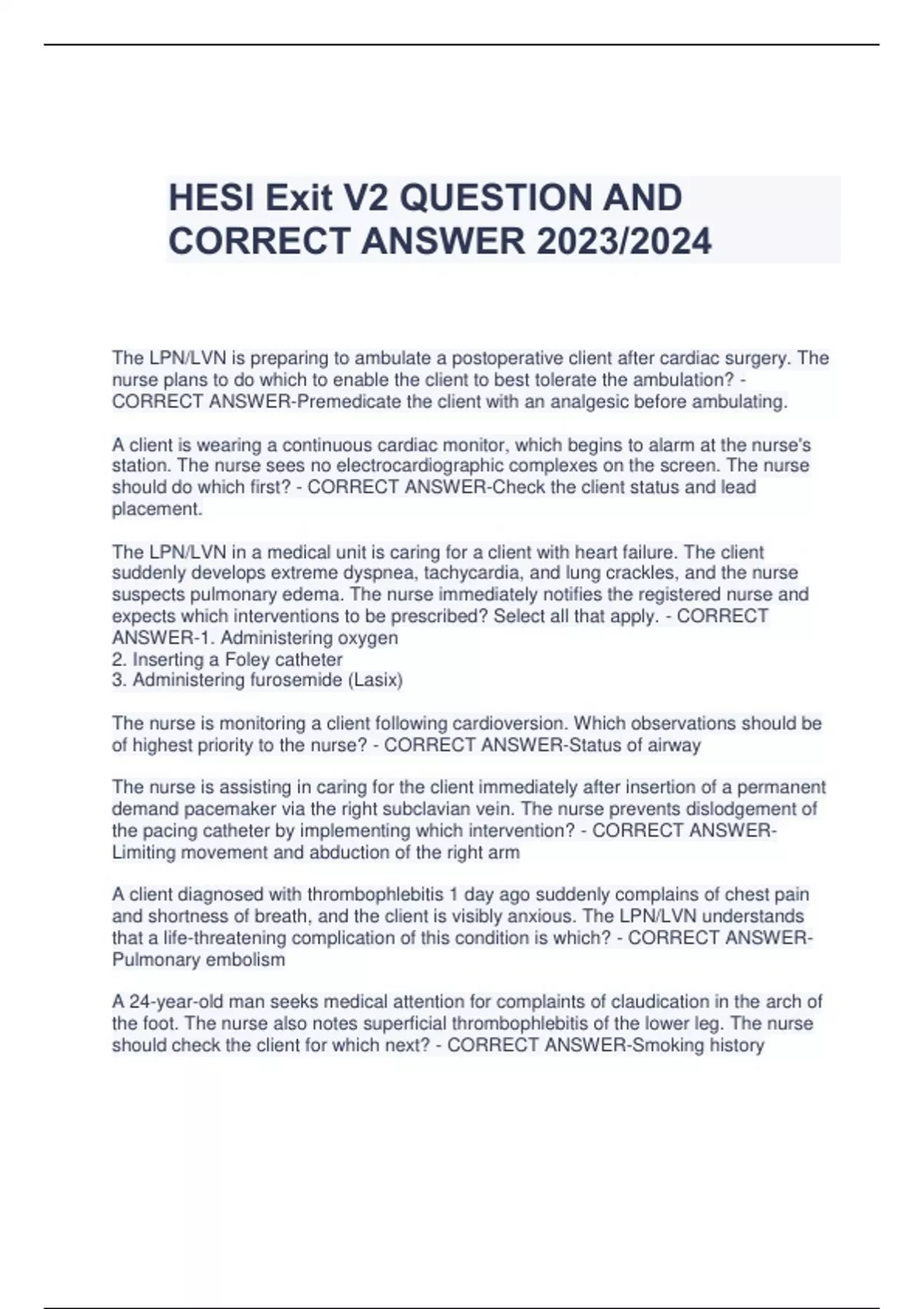 HESI Exit V2 QUESTION AND CORRECT ANSWER 2023/2024 The LPN/LVN is preparing to ambulate a postoperative client after cardiac surgery. The nurse plans to do which to enable the client to best tolerate the ambulation? - CORRECT ANSWER-Premedicate the client with an analgesic before ambulating. A client is wearing a continuous cardiac monitor, which begins to alarm at the nurse's station. The nurse sees no electrocardiographic complexes on the screen. The nurse should do which first? - CORRECT ANSWER-Check the client status and lead placement. The LPN/LVN in a medical unit is caring for a client with heart failure. The client suddenly develops extreme dyspnea, tachycardia, and lung crackles, and the nurse suspects pulmonary edema. The nurse immediately notifies the registered nurse and expects which interventions to be prescribed? Select all that apply. - CORRECT ANSWER-1. Administering oxygen 2. Inserting a Foley catheter 3. Administering furosemide (Lasix) The nurse is monitoring a client following cardioversion. Which observations should be of highest priority to the nurse? - CORRECT ANSWER-Status of airway The nurse is assisting in caring for the client immediately after insertion of a permanent demand pacemaker via the right subclavian vein. The nurse prevents dislodgement of the pacing catheter by implementing which intervention? - CORRECT ANSWERLimiting movement and abduction of the right arm A client diagnosed with thrombophlebitis 1 day ago suddenly complains of chest pain and shortness of breath, and the client is visibly anxious. The LPN/LVN understands that a life-threatening complication of this condition is which? - CORRECT ANSWERPulmonary embolism A 24-year-old man seeks medical attention for complaints of claudication in the arch of the foot. The nurse also notes superficial thrombophlebitis of the lower leg. The nurse should check the client for which next? - CORRECT ANSWER-Smoking history The nurse has reinforced instructions to the client with Raynaud's disease about selfmanagement of the disease process. The nurse determines that the client needs further teaching if the client states which? - CORRECT ANSWER-"Moving to a warmer climate should help." A client with myocardial infarction suddenly becomes tachycardic, shows signs of air hunger, and begins coughing frothy, pink-tinged sputum. The nurse listens to breath sounds, expecting to hear which breath sounds bilaterally? - CORRECT ANSWERCrackles The LPN/LVN is collecting data on a client with a diagnosis of rightsided heart failure. The nurse should expect to note which specific characteristic of this condition? - CORRECT ANSWER-Dependent edema The LPN/LVN is checking the neurovascular status of a client who returned to the surgical nursing unit 4 hours ago after undergoing an aortoiliac bypass graft. The affected leg is warm, and the nurse notes redness and edema. The pedal pulse is palpable and unchanged from admission. The nurse interprets that the neurovascular status is which? - CORRECT ANSWER-Normal, caused by increased blood flow through the leg A client with a diagnosis of rapid rate atrial fibrillation asks the nurse why the health care provider is going to perform carotid massage. The LPN/LVN responds that this procedure may stimulate which? - CORRECT ANSWER-Vagus nerve to slow the heart rate A client is admitted to the hospital with possible rheumatic endocarditis. The LPN/LVN should check for a history of which type of infection? - CORRECT ANSWERStaphylococcal infection client has an Unna boot applied for treatment of a venous stasis leg ulcer. The LPN/LVN notes that the client's toes are mottled, and cool and the client verbalizes some numbness and tingling of the foot. Which interpretation should the nurse make of these findings? - CORRECT ANSWER-The boot has been applied too tightly A client with angina complains that the anginal pain is prolonged and severe and occurs at the same time each day, most often in the morning. On further data collection, the nurse notes that the pain occurs in the absence of precipitating factors. How should the LPN/LVN best describe this type of anginal pain? - CORRECT ANSWER-Variant angina The LPN/LVN is monitoring a client with an abdominal aortic aneurysm (AAA). Which finding is probably unrelated to the AAA? - CORRECT ANSWER-Hyperactive bowel sounds in the area An emergency department client who complains of slightly improved but unrelieved chest pain for 2 days is reluctant to take a nitroglycerin sublingual tablet offered by the nurse. The client states, "I don't need that—my dad takes that for his heart. There's nothing wrong with my heart." Which description best describes the client's response? - CORRECT ANSWER-Denial A client is scheduled for a cardiac catheterization using a radiopaque dye. The LPN/LVN checks which most critical item before the procedure? - CORRECT ANSWER-Prior reaction to contrast media A client is scheduled for a dipyridamole thallium scan. The LPN/ LVN should check to make sure that the client has not consumed which substance before the procedure? - CORRECT ANSWER-Caffeine An ambulatory clinic nurse is interviewing a client who is complaining of flulike symptoms. The client suddenly develops chest pain. Which question best assists the nurse to discriminate pain caused by a non cardiac problem? - CORRECT ANSWER- "Does the pain get worse when you breathe in?" A client with myocardial infarction (MI) has been transferred from the coronary care unit (CCU) to the general medical unit with cardiac monitoring via telemetry. The nurse assisting in caring for the client expects to note which type of activity prescribed? - CORRECT ANSWER-Bathroom privileges and self-care activities The LPN/LVN is preparing to care for a client who will be arriving from the recovery room after an above-the-knee amputation. The nurse ensures that which priority item is available for emergency use? - CORRECT ANSWER-Surgical tourniquet A client is diagnosed with thrombophle