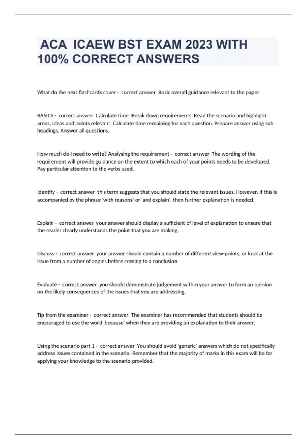 What do the next flashcards cover - correct answer Basic overall guidance relevant to the paper BASICS - correct answer Calculate time. Break down requirements. Read the scenario and highlight areas, ideas and points relevant. Calculate time remaining for each question. Prepare answer using sub headings. Answer all questions. How much do I need to write? Analysing the requirement - correct answer The wording of the requirement will provide guidance on the extent to which each of your points needs to be developed. Pay particular attention to the verbs used. Identify - correct answer this term suggests that you should state the relevant issues. However, if this is accompanied by the phrase 'with reasons' or 'and explain', then further explanation is needed. Explain - correct answer your answer should display a sufficient of level of explanation to ensure that the reader clearly understands the point that you are making. Discuss - correct answer your answer should contain a number of different view-points, or look at the issue from a number of angles before coming to a conclusion. Evaluate - correct answer you should demonstrate judgement within your answer to form an opinion on the likely consequences of the issues that you are addressing. Tip from the examiner - correct answer The examiner has recommended that students should be encouraged to use the word 'because' when they are providing an explanation to their answer. Using the scenario part 1 - correct answer You should avoid 'generic' answers which do not specifically address issues contained in the scenario. Remember that the majority of marks in this exam will be for applying your knowledge to the scenario provided.