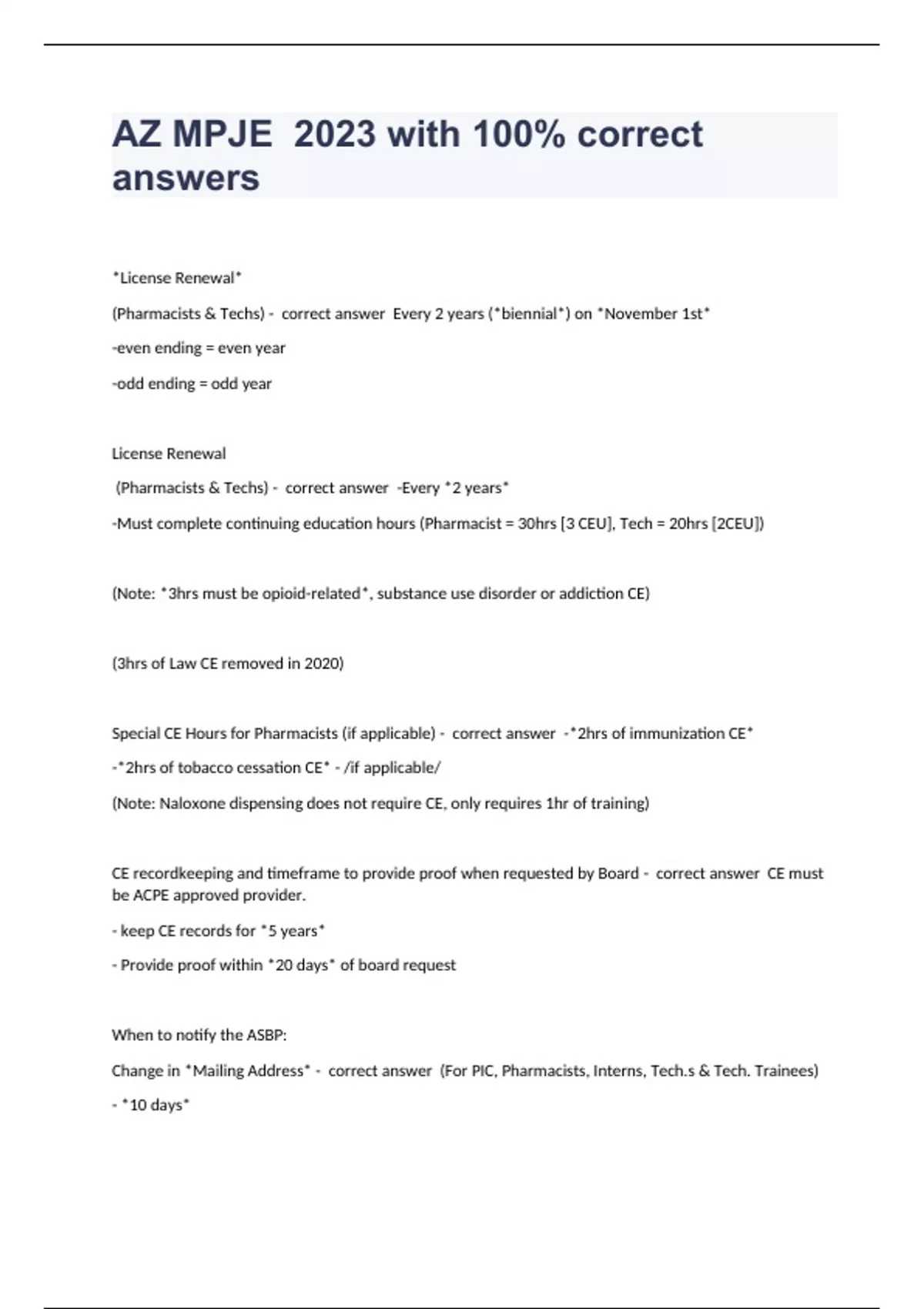 *License Renewal* (Pharmacists & Techs) - correct answer Every 2 years (*biennial*) on *November 1st* -even ending = even year -odd ending = odd year License Renewal (Pharmacists & Techs) - correct answer -Every *2 years* -Must complete continuing education hours (Pharmacist = 30hrs [3 CEU], Tech = 20hrs [2CEU]) (Note: *3hrs must be opioid-related*, substance use disorder or addiction CE) (3hrs of Law CE removed in 2020) Special CE Hours for Pharmacists (if applicable) - correct answer -*2hrs of immunization CE* -*2hrs of tobacco cessation CE* - /if applicable/ (Note: Naloxone dispensing does not require CE, only requires 1hr of training) CE recordkeeping and timeframe to provide proof when requested by Board - correct answer CE must be ACPE approved provider. - keep CE records for *5 years* - Provide proof within *20 days* of board request When to notify the ASBP: Change in *Mailing Address* - correct answer (For PIC, Pharmacists, Interns, Tech.s & Tech. Trainees) - *10 days*
