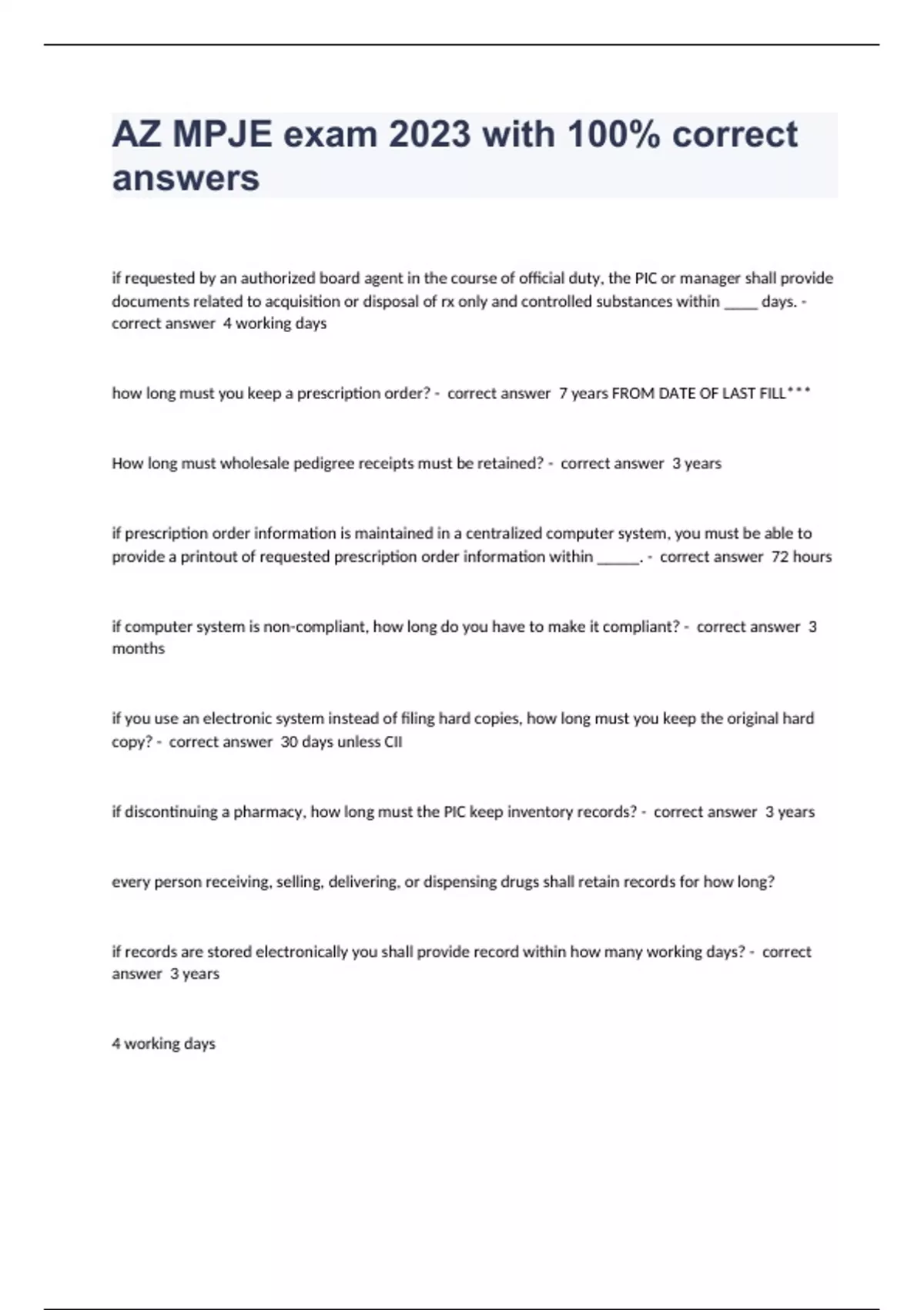 if requested by an authorized board agent in the course of official duty, the PIC or manager shall provide documents related to acquisition or disposal of rx only and controlled substances within ____ days. - correct answer 4 working days how long must you keep a prescription order? - correct answer 7 years FROM DATE OF LAST FILL*** How long must wholesale pedigree receipts must be retained? - correct answer 3 years if prescription order information is maintained in a centralized computer system, you must be able to provide a printout of requested prescription order information within _____. - correct answer 72 hours if computer system is non-compliant, how long do you have to make it compliant? - correct answer 3 months if you use an electronic system instead of filing hard copies, how long must you keep the original hard copy? - correct answer 30 days unless CII if discontinuing a pharmacy, how long must the PIC keep inventory records? - correct answer 3 years every person receiving, selling, delivering, or dispensing drugs shall retain records for how long? if records are stored electronically you shall provide record within how many working days? - correct answer 3 years 4 working days