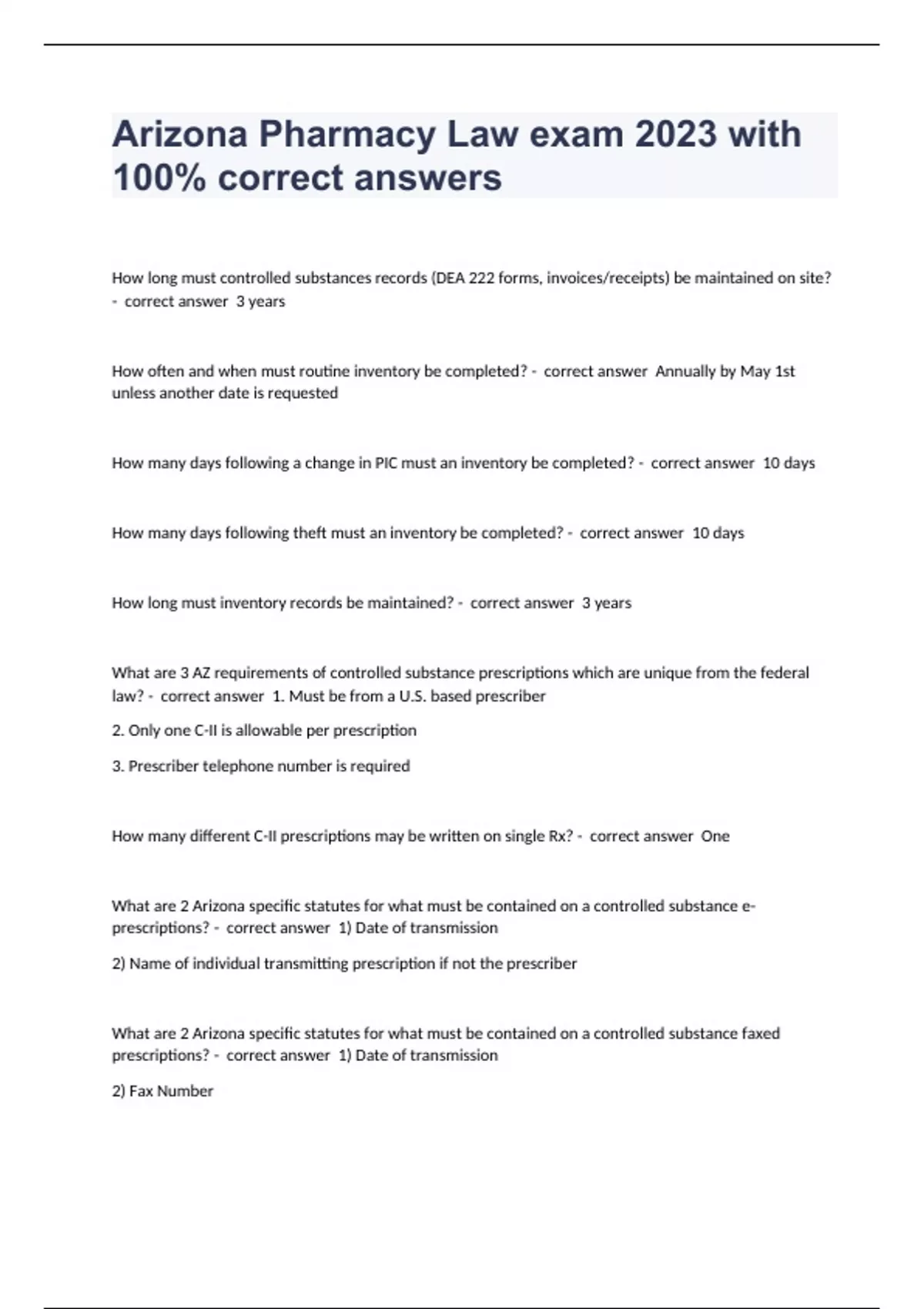 How long must controlled substances records (DEA 222 forms, invoices/receipts) be maintained on site? - correct answer 3 years How often and when must routine inventory be completed? - correct answer Annually by May 1st unless another date is requested How many days following a change in PIC must an inventory be completed? - correct answer 10 days How many days following theft must an inventory be completed? - correct answer 10 days How long must inventory records be maintained? - correct answer 3 years What are 3 AZ requirements of controlled substance prescriptions which are unique from the federal law? - correct answer 1. Must be from a U.S. based prescriber 2. Only one C-II is allowable per prescription 3. Prescriber telephone number is required How many different C-II prescriptions may be written on single Rx? - correct answer One What are 2 Arizona specific statutes for what must be contained on a controlled substance e-prescriptions? - correct answer 1) Date of transmission 2) Name of individual transmitting prescription if not the prescriber What are 2 Arizona specific statutes for what must be contained on a controlled substance faxed prescriptions? - correct answer 1) Date of transmission 2) Fax Number 3) Name