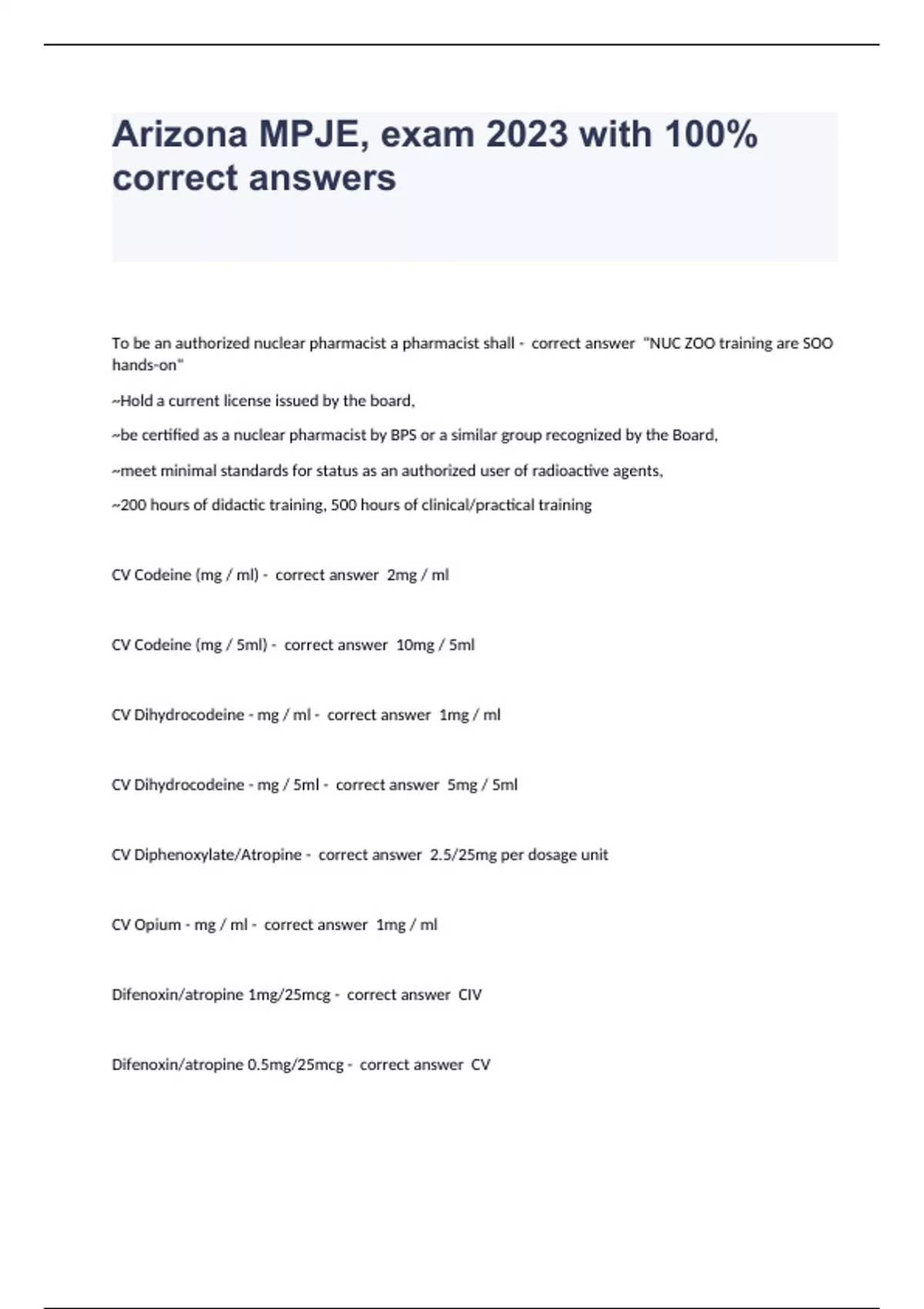 To be an authorized nuclear pharmacist a pharmacist shall - correct answer "NUC ZOO training are SOO hands-on" ~Hold a current license issued by the board, ~be certified as a nuclear pharmacist by BPS or a similar group recognized by the Board, ~meet minimal standards for status as an authorized user of radioactive agents, ~200 hours of didactic training, 500 hours of clinical/practical training CV Codeine (mg / ml) - correct answer 2mg / ml CV Codeine (mg / 5ml) - correct answer 10mg / 5ml CV Dihydrocodeine - mg / ml - correct answer 1mg / ml CV Dihydrocodeine - mg / 5ml - correct answer 5mg / 5ml CV Diphenoxylate/Atropine - correct answer 2.5/25mg per dosage unit CV Opium - mg / ml - correct answer 1mg / ml Difenoxin/atropine 1mg/25mcg - correct answer CIV Difenoxin/atropine 0.5mg/25mcg - correct answer CV Difenoxin - correct answer CI Prega