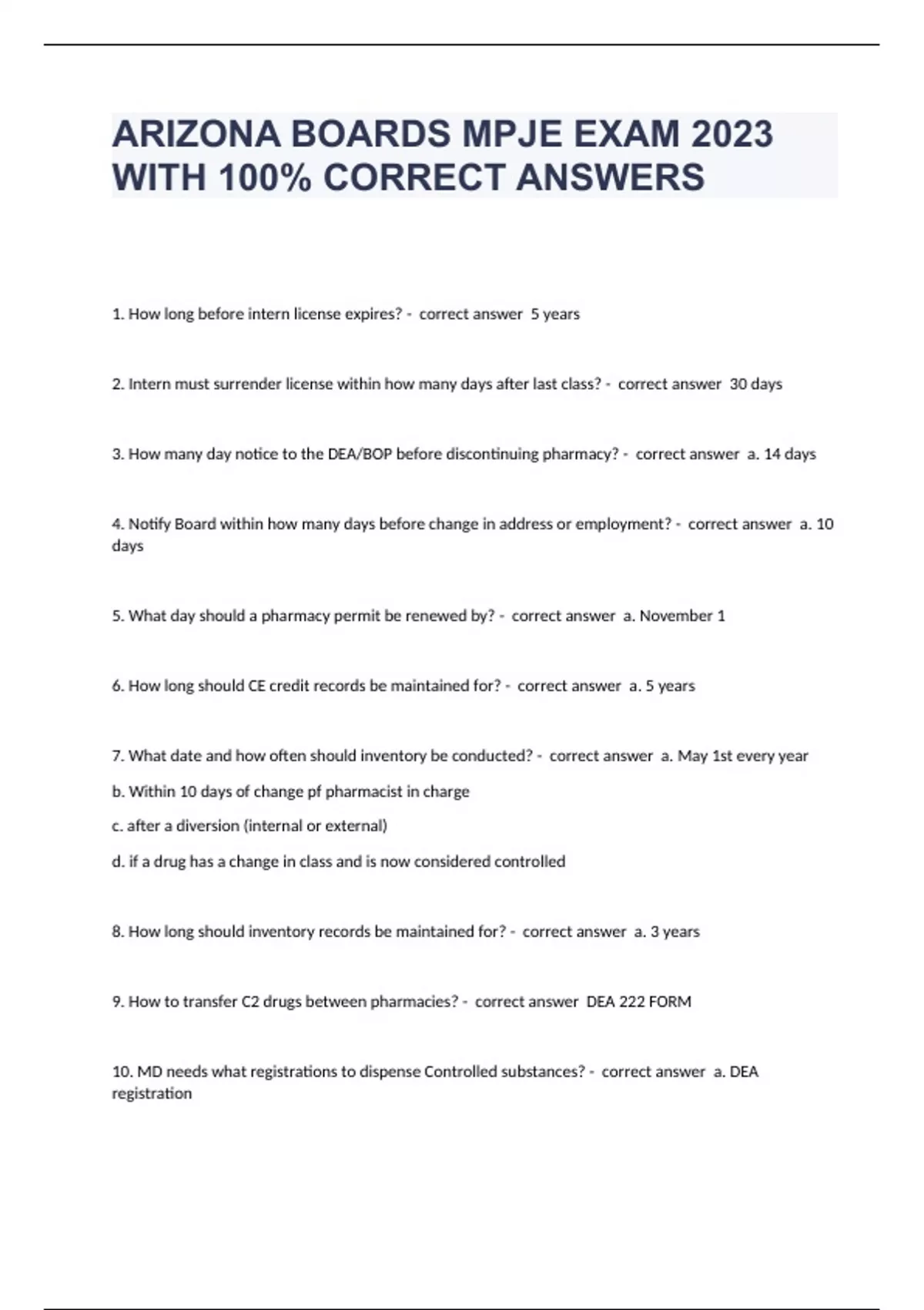 1. How long before intern license expires? - correct answer 5 years 2. Intern must surrender license within how many days after last class? - correct answer 30 days 3. How many day notice to the DEA/BOP before discontinuing pharmacy? - correct answer a. 14 days 4. Notify Board within how many days before change in address or employment? - correct answer a. 10 days 5. What day should a pharmacy permit be renewed by? - correct answer a. November 1 6. How long should CE credit records be maintained for? - correct answer a. 5 years 7. What date and how often should inventory be conducted? - correct answer a. May 1st every year b. Within 10 days of change pf pharmacist in charge c. after a diversion (internal or external) d. if a drug has a change in class and is now considered controlled 8. How long should inventory records be maintained for? - correct answer a. 3 years 9. How to transfer C2 drugs between pharmacies? - correct answer DEA 222 FORM 10. MD needs what registrations to dispense Controlled substances? - correct answer a. DEA registrat