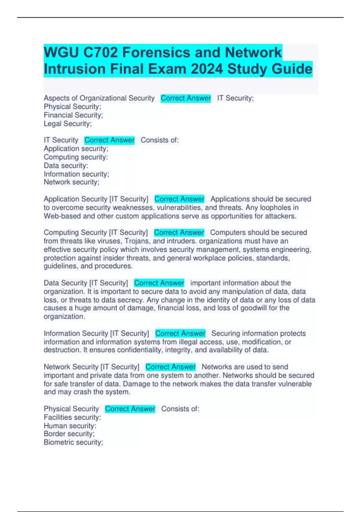 WGU C702 Forensics and Network Intrusion Final Exam 2024 Study Guide Aspects of Organizational Security Correct Answer IT Security; Physical Security; Financial Security; Legal Security; IT Security Correct Answer Consists of: Application security; Computing security: Data security: Information secur