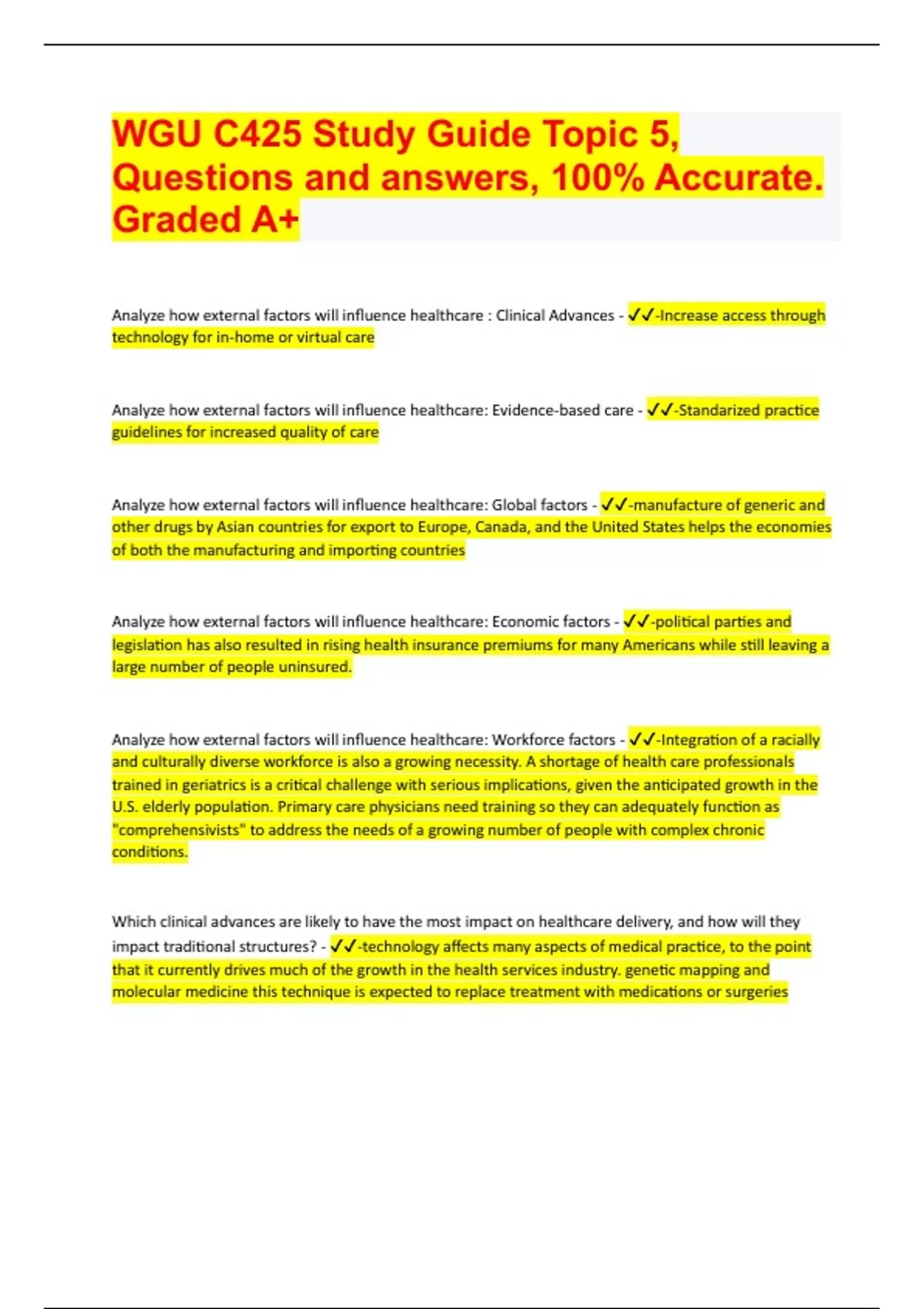 WGU C425 Study Guide Topic 5, Questions and answers, 100% Accurate. Graded A+ Analyze how external factors will influence healthcare : Clinical Advances - -Increase access through technology for in-home or virtual care Analyze how external factors will influence healthcare: Evidence-based care - -Standarized practice guidelines for increased quality of care Analyze how external factors will influence healthcare: Global factors - -manufacture of generic and other drugs by Asian countries for export to Europe, Canada, and the United States helps the economies of both the manufacturing and importing countries Analyze how external factors will influence healthcare: Economic factors - -political parties and legislation has also resulted in rising health insurance premiums for many Americans while still leaving a large number of people uninsured. Analyze how external factors will influence healthcare: Workforce factors - -Integration of a racially and culturally diverse workforce is also a growing necessity. A shortage of health care professionals trained in geriatrics is a critical challenge with serious implications, given the anticipated growth in the U.S. elderly population. Primary care physicians need training so they can adequately function as "comprehensivists" to address the needs of a growing number of people with complex chronic conditions. Which clinical advances are likely to have the most impact on healthcare delivery, and how will they impact traditional structures? - -technology affects many aspects of medical practice, to the point that it currently drives much of the growth in the health services industry. genetic mapping and molecular medicine this technique is expected to replace treatment with medications or surgeries How can organizations ensure evidence-based care has a positive impact on healthcare delivery? - - clinical practice guidelines are designed to provide evidence-based or well-researched protocols to guide physicians' clinical decisions and to promote lower costs