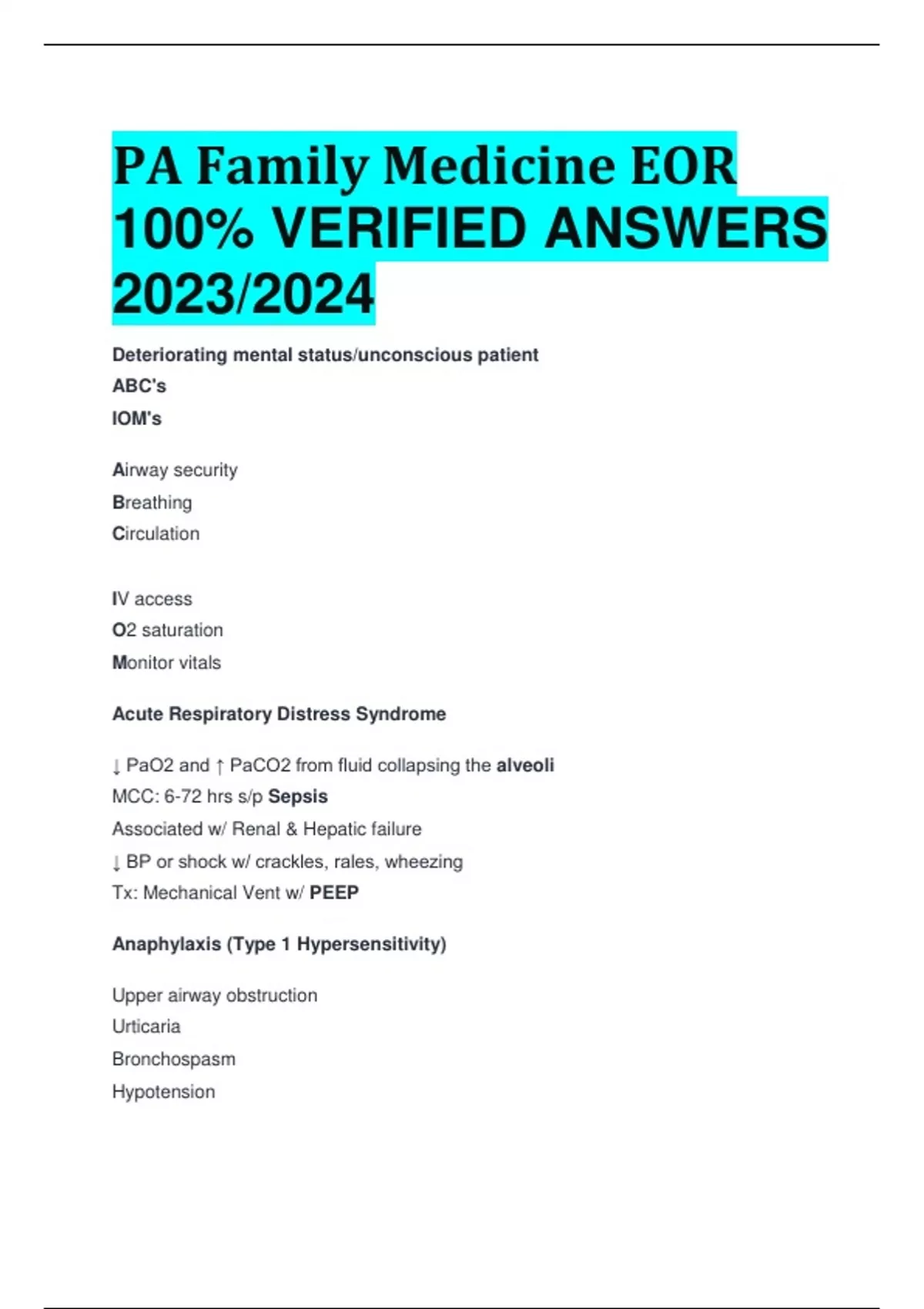 PA Family Medicine EOR 100% VERIFIED ANSWERS 2023/2024