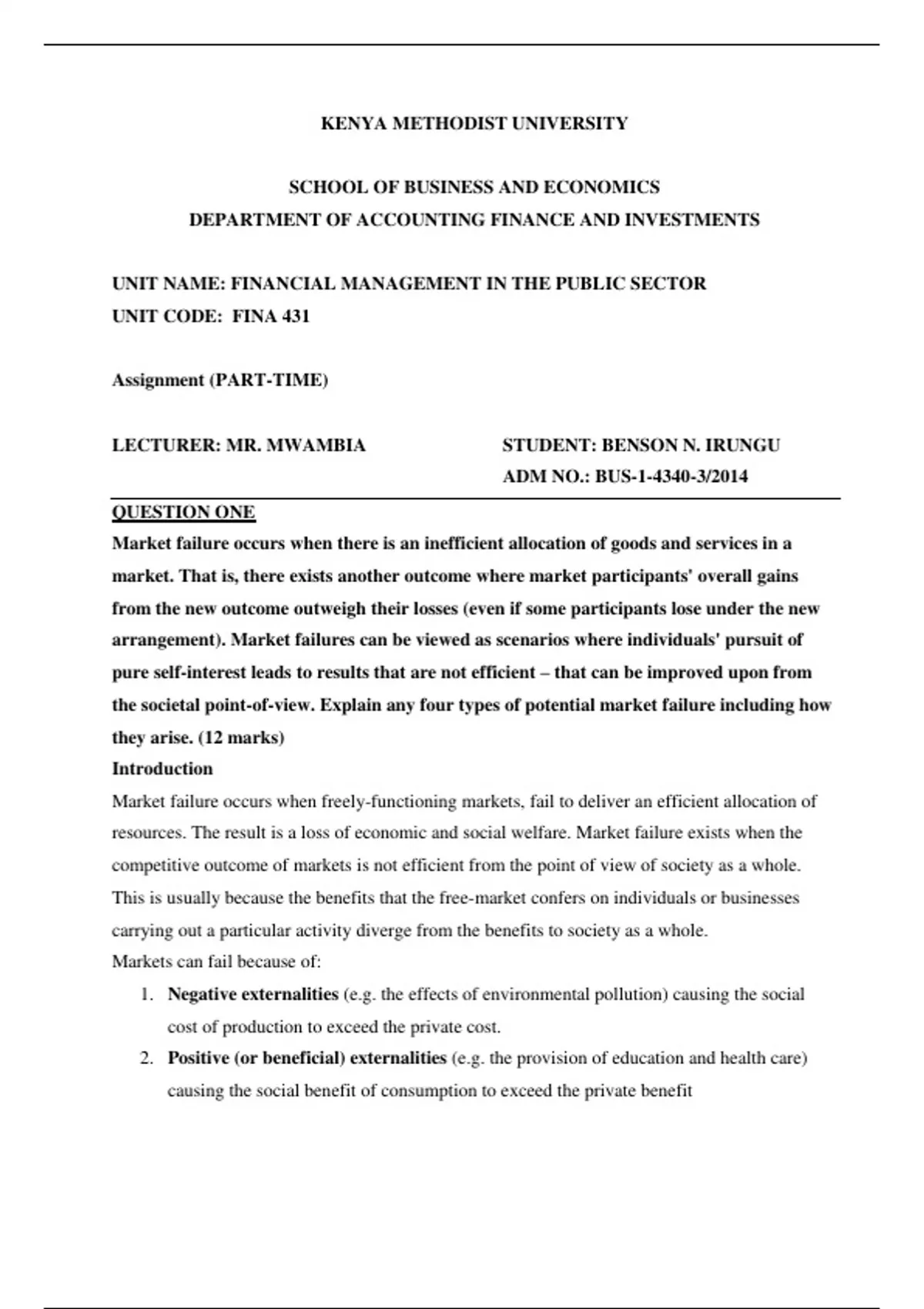 FINA 431 FINANCIAL MANAGEMENT IN THE PUBLIC SECTOR Latest Verified Review 2023 Practice Questions and Answers for Exam Preparation, 100% Correct with Explanations, Highly Recommended, Download to Score A+ QUESTION ONE Market failure occurs when there is an inefficient allocation of goods and services in a market. That is, there exists another outcome where market participants' overall gains from the new outcome outweigh their losses (even if some participants lose under the new arrangement). Market failures can be viewed as scenarios where individuals' pursuit of pure self-interest leads to results that are not efficient – that can be improved upon from the societal point-of-view. Explain any four types of potential market failure including how they arise. (12 marks) Introduction Market failure occurs when freely-functioning markets, fail to deliver an efficient allocation of resources. The result is a loss of economic and social welfare. Market failure exists when the competitive outcome of markets is not efficient from the point of view of society as a whole. This is usually because the benefits that the free-market confers on individuals or businesses carrying out a particular activity diverge from the benefits to society as a whole. Markets can fail because of: 1. Negative externalities (e.g. the effects of environmental pollution) causing the social cost of production to exceed the private cost. 2. Positive (or beneficial) externalities (e.g. the provision of education and health care) causing the social benefit of consumption to exceed the private benefit 3. Imperfect information means merit goods are under-produced while demerit goods are over-produced or over-consumed 4. The private sector in a free-markets cannot profitably supply to consumers pure public goods and quasi-public goods that are needed to meet people’s needs and wants 5. Market dominance by monopolies can lead to under-production and higher prices than would exist under conditions of competition 6. Factor immobility causes unemployment hence productive inefficiency 7. Equity (fairness) issues. Markets can generate an ‘unacceptable’ distribution of income and consequent social exclusion which the government may choose to change