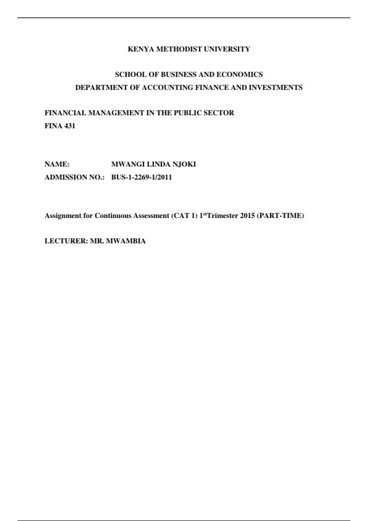 - FINA 431 FINANCIAL MANAGEMENT IN THE PUBLIC SECTOR