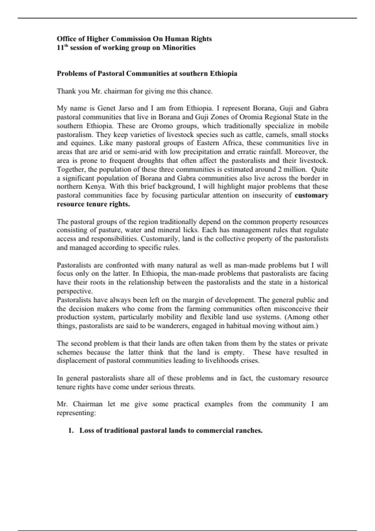 Problems of Pastoral Communities at southern Ethiopia Latest Verified Review 2023 Practice Questions and Answers for Exam Preparation, 100% Correct with Explanations, Highly Recommended, Download to Score A+ Problems of Pastoral Communities at southern Ethiopia Thank you Mr. chairman for giving me this chance. My name is Genet Jarso and I am from Ethiopia. I represent Borana, Guji and Gabra pastoral communities that live in Borana and Guji Zones of Oromia Regional State in the southern Ethiopia. These are Oromo groups, which traditionally specialize in mobile pastoralism. They keep varieties of livestock species such as cattle, camels, small stocks and equines. Like many pastoral groups of Eastern Africa, these communities live in areas that are arid or semi-arid with low precipitation and erratic rainfall. Moreover, the area is prone to frequent droughts that often affect the pastoralists and their livestock. Together, the population of these three communities is estimated around 2 million. Quite a significant population of Borana and Gabra communities also live across the border in northern Kenya. With this brief background, I will highlight major problems that these pastoral communities face by focusing particular attention on insecurity of customary resource tenure rights. The pastoral groups of the region traditionally depend on the common property resources consisting of pasture, water and mineral licks. Each has management rules that regulate access and responsibilities. Customarily, land is the collective property of the pastoralists and managed according to specific rules. Pastoralists are confronted with many natural as well as man-made problems but I will focus only on the latter. In Ethiopia, the man-made problems that pastoralists are facing have their roots in the relationship between the pastoralists and the state in a historical perspective. Pastoralists have always been left on the margin of development. The general public and the decision makers who come from the farming communities often misconceive their production system, particularly mobility and flexible land use systems. (Among other things, pastoralists are said to be wanderers, engaged in habitual moving without aim.) The second problem is that their lands are often taken from them by the states or private schemes because the latter think that the land is empty. These have resulted in displacement of pastoral communities leading to livelihoods crises. In general pastoralists share all of these problems and in fact, the customary resource tenure rights have come under serious threats. Mr. Chairman let me give some practical examples from the community I am representing: