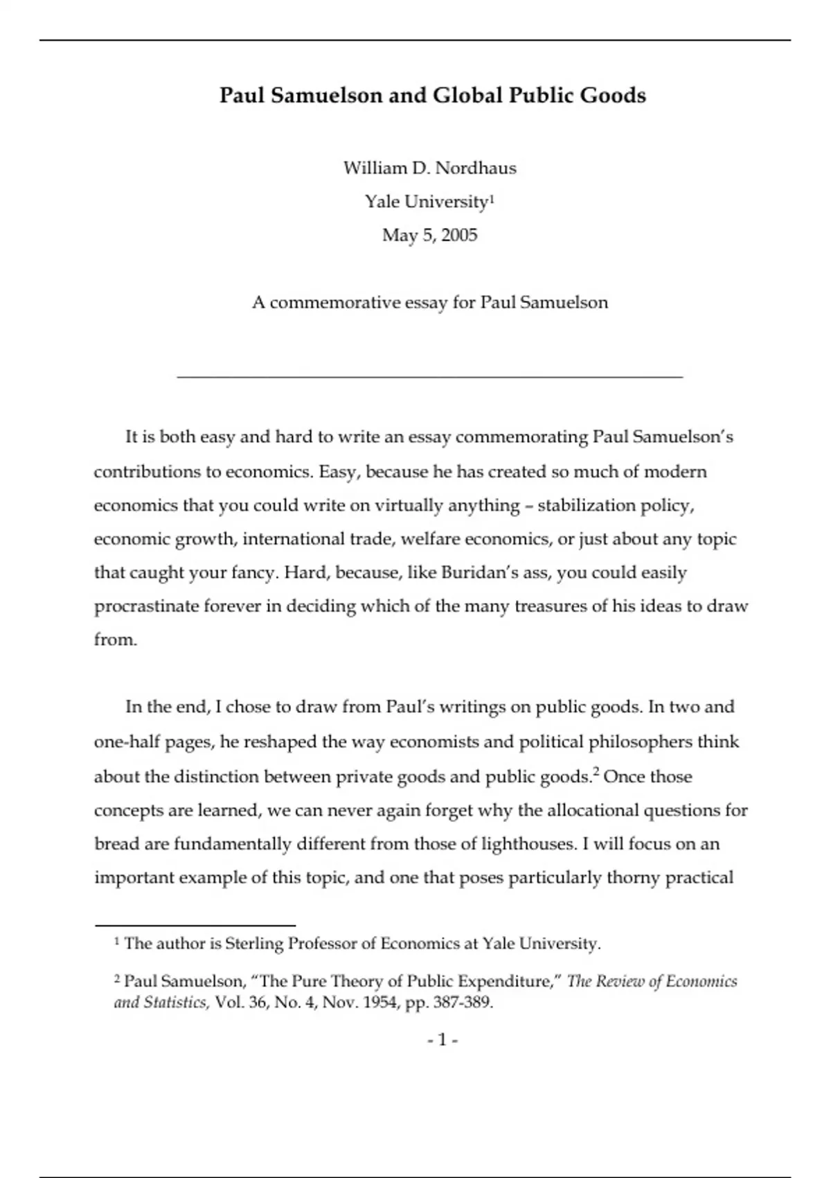 Paul Samuelson and Global Public Goods Latest Verified Review 2023 Practice Questions and Answers for Exam Preparation, 100% Correct with Explanations, Highly Recommended, Download to Score A+ It is both easy and hard to write an essay commemorating Paul Samuelson’s contributions to economics. Easy, because he has created so much of modern economics that you could write on virtually anything – stabilization policy, economic growth, international trade, welfare economics, or just about any topic that caught your fancy. Hard, because, like Buridan’s ass, you could easily procrastinate forever in deciding which of the many treasures of his ideas to draw from. In the end, I chose to draw from Paul’s writings on public goods. In two and one-half pages, he reshaped the way economists and political philosophers think about the distinction between private goods and public goods.2 Once those concepts are learned, we can never again forget why the allocational questions for bread are fundamentally different from those of lighthouses. I will focus on an important example of this topic, and one that poses particularly thorny practical