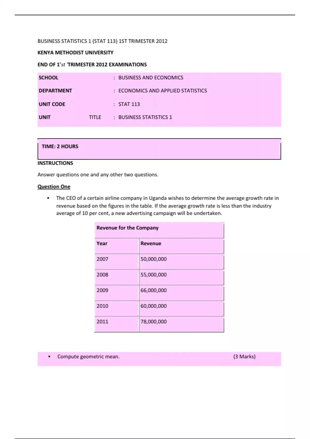 REVISION QUESTIONS BUSINESS STATISTICS 1 (STAT 113) Latest Verified Review 2023 Practice Questions and Answers for Exam Preparation, 100% Correct with Explanations, Highly Recommended, Download to Score A+ Question One The CEO of a certain airline company in Uganda wishes to determine the average growth rate in revenue based on the figures in the table. If the average growth rate is less than the industry average of 10 per cent, a new advertising campaign will be undertaken. Revenue for the Company Year Revenue 2007 50,000,000 2008 55,000,000 2009 66,000,000 2010 60,000,000 2011 78,000,000 Compute geometric mean. (3 Marks) Should the company undertake a new advertising campaign? Explain. (2 Marks) Non-sampling error is more serious than sampling error, because taking a large sample won’t diminish the size, or the possibility of occurrence, of this error. Even a census can (and probably will) contain non-sampling errors. State and clearly explain three non-sampling errors. (6 Marks) Attempting to analyze the relationship between advertising and sales, the owner of a furniture store recorded the monthly advertising budget (thousand of KES) and the sales (thousands of KES) for a sample of 12 months. The data are listed below. Where: X = advertising. Y = sales. X 90 99 Y 9.6 11.3 12.8 9.8 8.9 12.5 12 11.4 12.6 13.7 14.4 15.9 Calculate the covariance of the two variables. (3 Marks) Determine the coefficient of correlation. (3 Marks) What do these statistics tell you about the relationship between advertising and sales? (1 Mark) Statistics play an important role in business management. But this is restricted by its limitations. Explain any three limitations of statistics. (6 Marks) The method of instruction in university applied statistics courses is changing. Historically, most courses were taught with an emphasis on manual calculation. The alternative is to employ a computer and a software package to perform the calculations. An analysis of applied statistics courses investigated whether the instructor’s educational background is primarily mathematics (or statistics) or some other field. The result of this analysis is the accompanying table of joint probabilities. Statistics course emphasizes manual calculations Statistics course employ computer and software Mathematics or statistics education 0.23 0.36 Other education 0.11 0.30 What is the probability that a randomly selected applied statistics course instructor whose education was in statistics emphasizes manual calculations? (3 Marks) What proportion of applied statistics courses employs a computer and software? (2 Marks) Are the educational background of the instructor and the way his or her course is taught independent? (1 Mark)