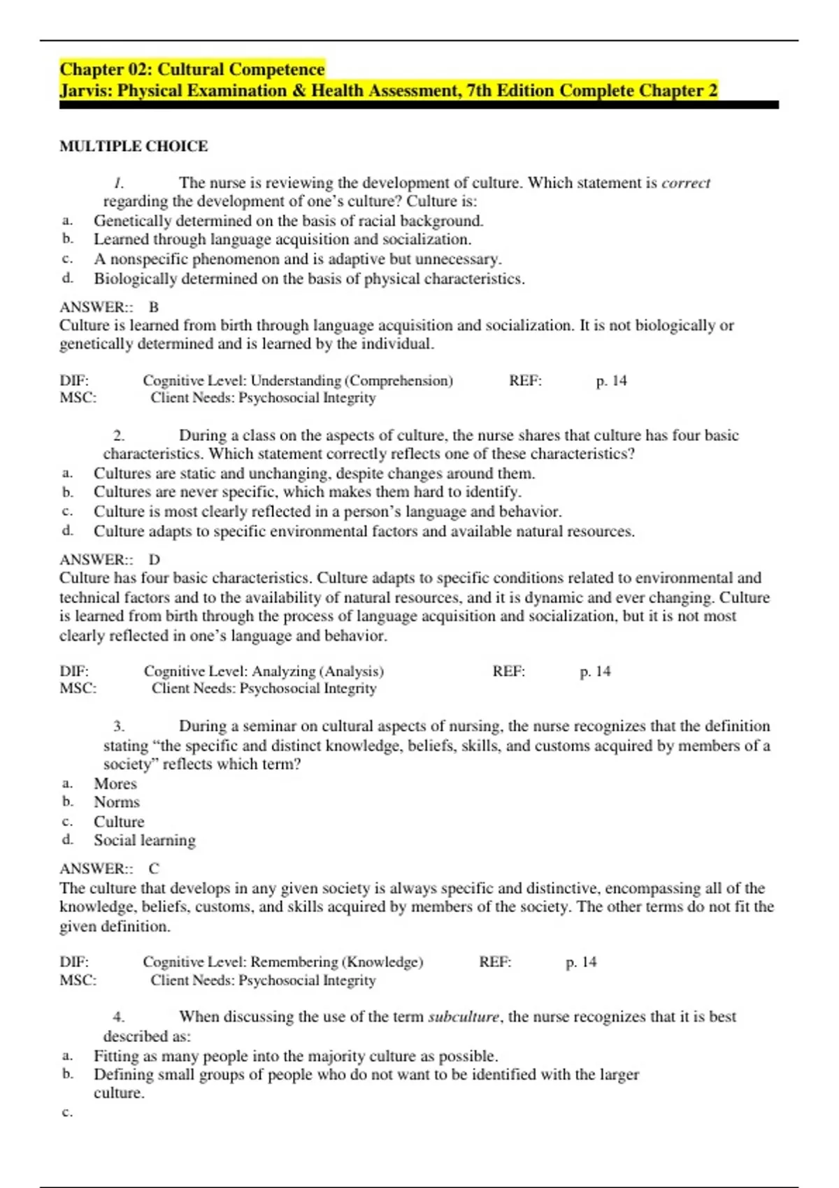 Chapter 02: Cultural Competence Jarvis: Physical Examination & Health Assessment, 7th Edition Complete Chapter 2 MULTIPLE CHOICE 1. The nurse is reviewing the development of culture. Which statement is correct regarding the development of one’s culture? Culture is: a. Genetically determined on the basis of racial background. b. Learned through language acquisition and socialization. c. A nonspecific phenomenon and is adaptive but unnecessary. d. Biologically determined on the basis of physical characteristics. ANSWER:: B Culture is learned from birth through language acquisition and socialization. It is not biologically or genetically determined and is learned by the individual. DIF: Cognitive Level: Understanding (Comprehension) REF: p. 14 MSC: Client Needs: Psychosocial Integrity 2. During a class on the aspects of culture, the nurse shares that culture has four basic characteristics. Which statement correctly reflects one of these characteristics? a. Cultures are static and unchanging, despite changes around them. b. Cultures are never specific, which makes them hard to identify. c. Culture is most clearly reflected in a person’s language and behavior. d. Culture adapts to specific environmental factors and available natural resources. ANSWER:: D Culture has four basic characteristics. Culture adapts to specific conditions related to environmental and technical factors and to the availability of natural resources, and it is dynamic and ever changing. Culture is learned from birth through the process of language acquisition and socialization, but it is not most clearly reflected in on