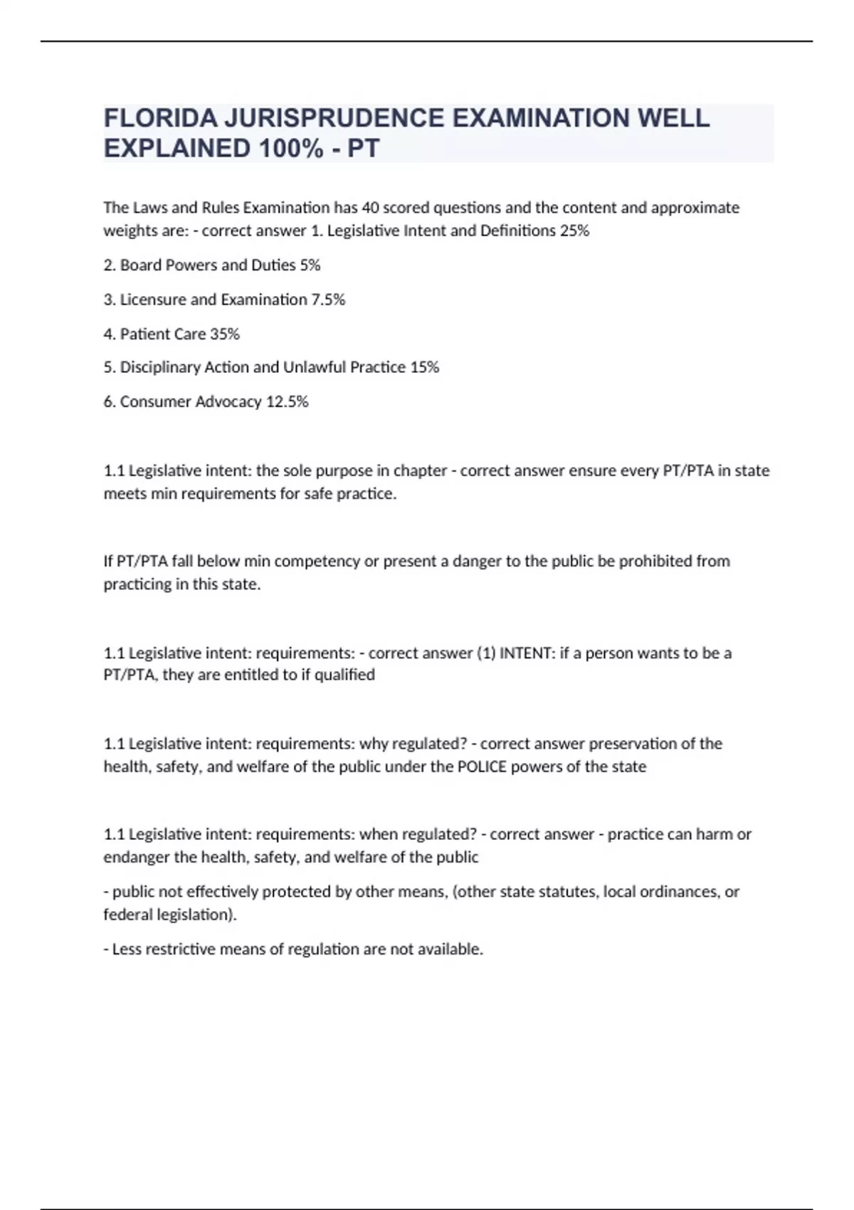 The Laws and Rules Examination has 40 scored questions and the content and approximate weights are: - correct answer 1. Legislative Intent and Definitions 25% 2. Board Powers and Duties 5% 3. Licensure and Examination 7.5% 4. Patient Care 35% 5. Disciplinary Action and Unlawful Practice 15% 6. Consumer Advocacy 12.5% 1.1 Legislative intent: the sole purpose in chapter - correct answer ensure every PT/PTA in state meets min requirements for safe practice. If PT/PTA fall below min competency or present a danger to the public be prohibited from practicing in this state. 1.1 Legislative intent: requirements: - correct answer (1) INTENT: if a person wants to be a PT/PTA, they are entitled to if qualified 1.1 Legislative intent: requirements: why regulated? - correct answer preservation of the health, safety, and welfare of the public under the POLICE powers of the state 1.1 Legislative intent: requirements: when regulated? - correct answer - practice can harm or endanger the health, safety, and welfare of the public - public not effectively protected by other means, (other state statutes, local ordinances, or federal legislation). - Less restrictive means of regulation are not available. 1.1 Legislative intent: requirements: restrictions - correct answer - Neither the department nor any board may take any action that tends to create or maintain an economic condition that unreasonably restricts competition - Neither the department nor any board may create a regulation that has an unreasonable effect on job creation or job retention in the state or that places unreasonable restrictions on the ability of individuals who seek to practice or who are practicing a profession or occupation to find employment. - all expenditures are made in the most cost-effective manner to maximize competition, minimize licensure costs, and maximize public access to meetings 1.2 "Physical therapy" or "physiotherapy," - correct answer deemed identical and interchangeable with each other, means a health care profession. 1.2 "Practice of physical therapy" - correct answer - assessments - treatment or prevention of any disability, injury, disease, or other health condition of human beings - physical, chemical, and other properties of air - electricity - exercise - massage; - acupuncture (only with compliance) when no penetration of the skin occurs - radiant energy, including ultraviolet, visible, and infrared rays - ultrasound; - water - apparatus and equipment - performance of tests of neuromuscular functions (to aid diagnosis or treatment) of any human condition - electromyography (aid in diagnosis of human condition - with compliance) - implement a plan of treatment for a patient if outside the scope of PT: - correct answer PT will refer the patient to or consult with a health care practitioner licensed under chapter 458, 459, 460, 461, or chapter 466, how long can PT treat without a referral? - correct answer 21 days the PT will obtain a practitioner of record who will review and sign the plan (licensed under chapter 458, 459, 460, 461, or chapter 466 and engaged in active practice) if longer than 21 days. May a PT use roentgen rays and radium for diagnostic and therapeutic purposes? - correct answer NO - outside the scope of PT. May a PT use electricity for surgical purposes, including cauterization? - correct answer NO - outside the scope of PT May a PT practice chiropractic medicine, including specific spinal manipulation? - correct answer NO - For specific chiropractic spinal manipulation, a PT will refer the patient to a health care practitioner licensed under chapter 460. Nothing in this subsection authorizes a physical therapist to implement a plan of treatment for a patient currently being treated in a facility licensed pursuant to chapter 395. - correct answer Chapter 395 = Hospital 1.3 "Physical Therapist" - correct answer licensed and who practices physical therapy in accordance with the provisions of this chapter. 1.3 "Physical Therapist Assistant" - correct answer - licensed in accordance with the provisions of this chapter to perform patient-related activities, including: physical agents - license in good standing - activities performed under the direction of a physical therapist Type of supervision for PTA for a board-certified orthopedic physician or physiatrist licensed chapter 458 (physician), 459 (osteopathic), or practitioner under chapter 460 (chiropractor) - correct answer general supervision of a physical therapist, but shall not require onsite supervision by a physical therapist. Type of supervision for PTA for Patient-related activities performed for all other health care practitioners licensed under chapter 458 (physician), 459 (osteopathic), or chapter 461 (Podiatric - foot & ankle), or chapter 466 (dentistry) - correct answer onsite supervision of a physical therapist. "Direct supervision" - correct answer requires the physical presence of the licensed PT for consultation and direction of the actions ( Except in a case of emergency) 1.3 "Physical therapy practitioner" - correct answer PT or PTA who is licensed and who practices physical therapy in accordance with the provisions of this chapter. 1.4 "License" - correct answer document of authorization granted by the board and issued by the department for a person to engage in the practice of physical therapy. 1.4 Reactivation of an Inactive or Retired License. - correct answer FEES ( - biennial renewal fee for inactive $50. 64B17-2.005(1), F.A.C.; - unlicensed activity fee $75 64B17-2.001(5) - reactivation fee $50 64B17-2.005(6) - change of status fee $50 64B17-2.001(7) CON ED - 64B17-9.001 - Prevention of medical errors - 10 hours per year license was inactive - including 2 hours on prevention of medical errors - No more than 6 hours may be completed by home study per year of inactive status - 2 hours on Florida Physical Therapy Laws and Rules within the 12 months immediately preceding DOCUMENTATION - applicant is licensed and in good stan