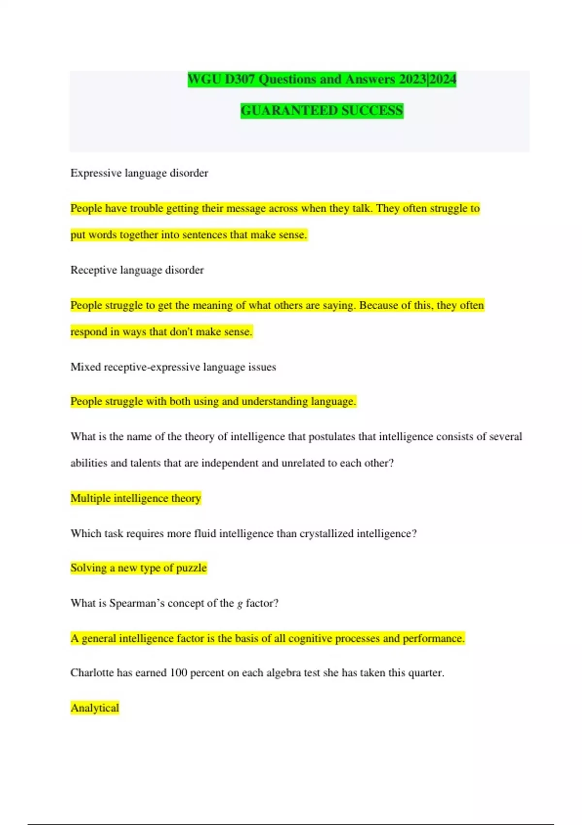 WGU D307 Questions and Answers 2023|2024 GUARANTEED SUCCESS Expressive language disorder People have trouble getting their message across when they talk. They often struggle to put words together into sentences that make sense. Receptive language disorder People struggle to get the meaning of what others are saying. Because of this, they often respond in ways that don't make sense. Mixed receptive-expressive language issues People struggle with both using and understanding language. What is the name of the theory of intelligence that postulates that intelligence consists of several abilities and talents that are independent and unrelated to each other? Multiple intelligence theory Which task requires more fluid intelligence than crystallized intelligence? Solving a new type of puzzle What is Spearman’s concept of the g factor? A general intelligence factor is the basis of all cognitive processes and performance. Charlotte has earned 100 percent on each algebra test she has taken this quarter. Analytica