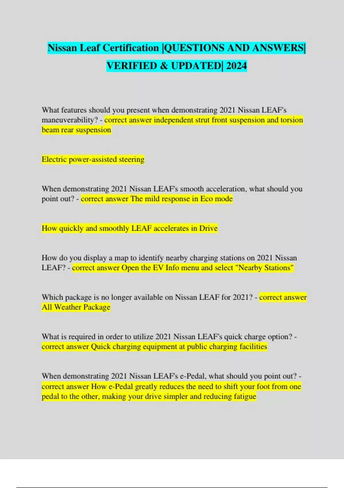 Nissan Leaf Certification |QUESTIONS AND ANSWERS| VERIFIED & UPDATED| 2024 What features should you present when demonstrating 2021 Nissan LEAF's maneuverability? - correct answer independent strut front suspension and torsion beam rear suspension Electric power-assisted steering When demonstrating 2021 Nissan LEAF's smooth acceleration, what should you point out? - correct answer The mild response in Eco mode How quickly and smoothly LEAF accelerates in Drive How do you display a map to identify nearby charging stations on 2021 Nissan LEAF? - correct answer Open the EV Info menu and select "Nearby Stations" Which package is no longer available on Nissan LEAF for 2021? - correct answer All Weather Package What is required in order to utilize 2021 Nissan LEAF's quick charge option? - correct answer Quick charging equipment at public charging facilities When demonstrating 2021 Nissan LEAF's e-Pedal, what should you point out? - correct answer How e-Pedal greatly reduces the need to shift your foot from one pedal to the other, making your drive simpler and reducing fatigu