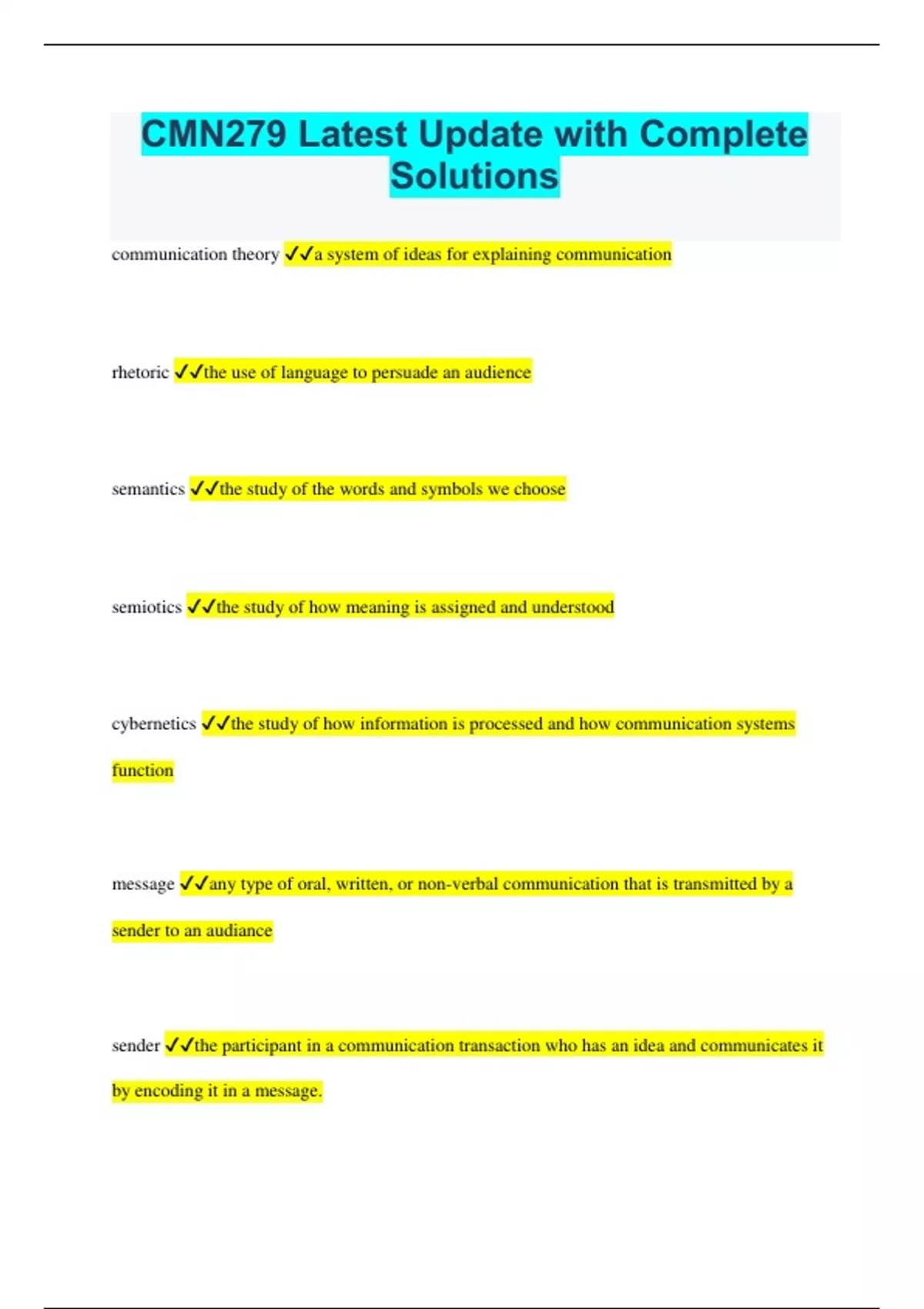 CMN279 Latest Update with Complete Solutions communication theory a system of ideas for explaining communication rhetoric the use of language to persuade an audience semantics the study of the words and symbols we choose semiotics the study of how meaning is assigned and understood cybernetics the study of how information is processed and how communication systems function message any type of oral, written, or non-verbal communication that is transmitted by a sender to an audiance sender the participant in a communication transaction who has an idea and communicates it by encoding it in a message. encoding the act of converting ideas into code in order to convert a written, an oral, or a non-verbal message channel a communication pathway or medium over which a message travels. receiver the participant in a communication transaction for whom a message is intended and who decodes the message by extracting meaning from it. decoding the act of extracting meaning from spoken, written, and non-verbal communication feedback the receivers response to a message that confirms if the original message was received and understood. noise any form or psychological interference that distorts the meaning of a message. communication barriers problems that can affect the communication transaction, leading to confusion or misunderstanding channel overload the inability of a channel to carry all transmitted messages information overload a condition whereby a receiver cannot process all messages because of their vast numbers emotional interference a psychological factor that creates problems with the communication transaction semantic interference interference caused by ambiguity, jargon, language or dialect differences, or different ways of assigning meaning bypassing misunderstanding that results from the receiver interfering a different meaning from s message based on the different meanings of the words that are used. physical and technical interference interference external to the sender and receiver ex. cell service dropped mixed messages conflicting perceptions of a signal or message that may result in miscommunication channel barriers inappropriate choices of channel that impede communication environmental interference interference that results from preconceptions and differing frames or reference. dyadic the form of communication that involves a group of two emotional intelligence the ability to be in touch with one's own emotions, manage one's emotions displays, and understand and respond to the emotions of others to foster strong interpersonal relationships. non-verbal behaviours gestures, facial expressions, eye contact, and posture that convey feelings, attitudes and other information proxemics the study of the use and perception of space chronemics the study of the use and inter pretence of time in non-verbal communication paralanguage (vocalics) (38%) non-verbal qualities of communication body language (55%) non-verbal communication conveyed by gestures, posture, eye contact, and facial expressions internal communication communication takes place within an organization external communication communication with audiences who are apart of an external environment active listening listening that demands close attention to a message's literal and emotional meaning and a level of responsiveness that shows the speaker the message was both heard and understood. formal communications network a system of communication sanctioned by organizational management informal oral network unofficial internal communication pathways, also known as grapevines, that carry gossip and rumours-sometimes accurate, sometimes not formal communication channels official internal communication pathways that facilitate the flow of information through an organizations hierarchy upward communication flow the movement of information from subordinates to superiors downward communication flow the movement of information from superiors to subordinates horizontal communication flow the movement of information that enables individuals at the same organizational level to share ideas and exchange information culture the shared values, customs, and patterns of behaviour of a particular group or society, including its rules, beliefs language and structures ethnocentrism the tendency to make false assumptions, based on limited experience, that one's own cultural or ethnic group is superior to others high-context cultures cultures in which communication depends not only on the explicit wording of a message but also on the message's surrounding context. low-context cultures cultures that favour direct communication and depend on explicit verbal and written messages exclusive of context contextual factors elements of a writing task, such as the situation, the organizations procedures, and the readers, that influence the writer's choices at every step. genres the agreed-upon forms of writing that develop in response to recurrent situations and that allow users to act purposefully in a particular activity register the level of formality gauged to a specific purpose and social setting discourse community a group of communicators who share a goal or an interest in adopting a way of participating in a public discussion, including the use of particular genres, registers, and terminology exigence the motivation or reason for speaking out urgently on a topic or an issue audience individuals with an interest in reacting to the exigence the receivers and decoders of a message constraints the restrictions or limitations on what can be said and the factors shaping the content and presentation of the message, which can affect audience response. Important of Message Planning -only have one change to get your message across with the most impact -purpose-driven: effective business communication is carried to the fullest. -audience focused: shape your message to your audience, get to know the audience - concise: word economy, only amount on words that is needed