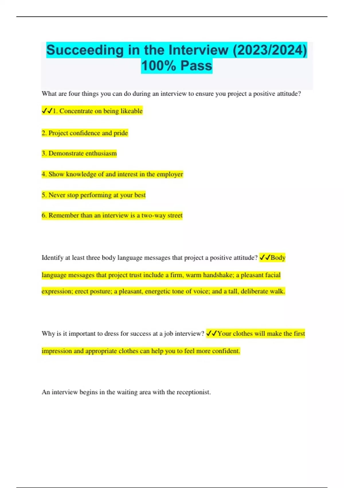 Succeeding in the Interview (2023/2024) 100% Pass What are four things you can do during an interview to ensure you project a positive attitude? 1. Concentrate on being likeable 2. Project confidence and pride 3. Demonstrate enthusiasm 4. Show knowledge of and interest in the employer 5. Never stop performing at your best 6. Remember than an interview is a two-way street Identify at least three body language messages that project a positive attitude? Body language messages that project trust include a firm, warm handshake; a pleasant facial expression; erect posture; a pleasant, energetic tone of voice; and a tall, deliberate walk. Why is it important to dress for success at a job interview? Your clothes will make the first impression and appropriate clothes can help you to feel more confident. An interview begins in the waiting area with the receptionist. Please select the best answer from the choices provided True False True What information should be included in a 60-second interview commercial? - Job target - Experience credentials - Education credentials - Proof of benefits provided - Related job skills/preferences - Transferable competencies Be prepared for any interviewing emergencies by bringing an interview survival pack. Please select the best answer from the choices provided True False True List 6 mistakes that can be made during an interview. -Sitting down before being invited -Bringing someone to the interview -Having a limp handshake -Chewing gum or smoking -Arriving late or too early -Badmouthing former employers -Talking too much During an interview, your _____ can be as influential as your skills and abilities. a. attitude b. image c. appearance d. all of the above D. All of the above Summarize the importance of body language during an interview. Body language can send a positive or negative message to the employer. The goal is to send positive messages. Positive messages can be sent by maintaining eye contact, sitting up straight, and having a firm handshake. Negative messages are sent when a person twitches, avoids eye contact, and slouches. You should dress conservatively and avoid flashy jewelry or clothes for an interview. Please select the best answer from the choices provided True False True When dressing for success you should NOT _____. a. dress neatly b. wear bright, flashy clothes c. wear minimal jewelry d. look clean b. wear bright, flashy clothes The process of sending and receiving messages without using any spoken words defines _____. a. verbal communication b. nonverbal communication c. open communication d. empty communication b. nonverbal communication Which of the following forms of communication has the most impact during your interview? a. Nonverbal b. Verbal c. Voice quality d. Intonation a. Nonverbal Which of the following is NOT an example of nonverbal communication? a. Using facial expressions b. Talking on the telephone c. Making eye contact d. Making hand gestures b. Talking on the telephone Prepare for an interview by having accurate and reliable maps to the interview's location. Please select the best answer from the choices provided True False True The process of sending and receiving messages with words defines _____. a. verbal communication b. nonverbal communication c. open communication d. empty communication a. verbal communication Employers will be evaluating your attitude and communication skills during an interview. Please select the best answer from the choices provided True False True One of the biggest mistakes you can make during an interview is failing to match the interviewer's communication style. Please select the best answer from the choices provided True False True The best way to convince employers of your skills and abilities is to _____. a. provide a written list, such as in your resume b. offer proof by example in answering interview questions c. have the employer contact your references d. none of the above b. offer proof by example in answering interview questions During an interview you should be modest about your skills and abilities. Please select the best answer from the choices provided True False False