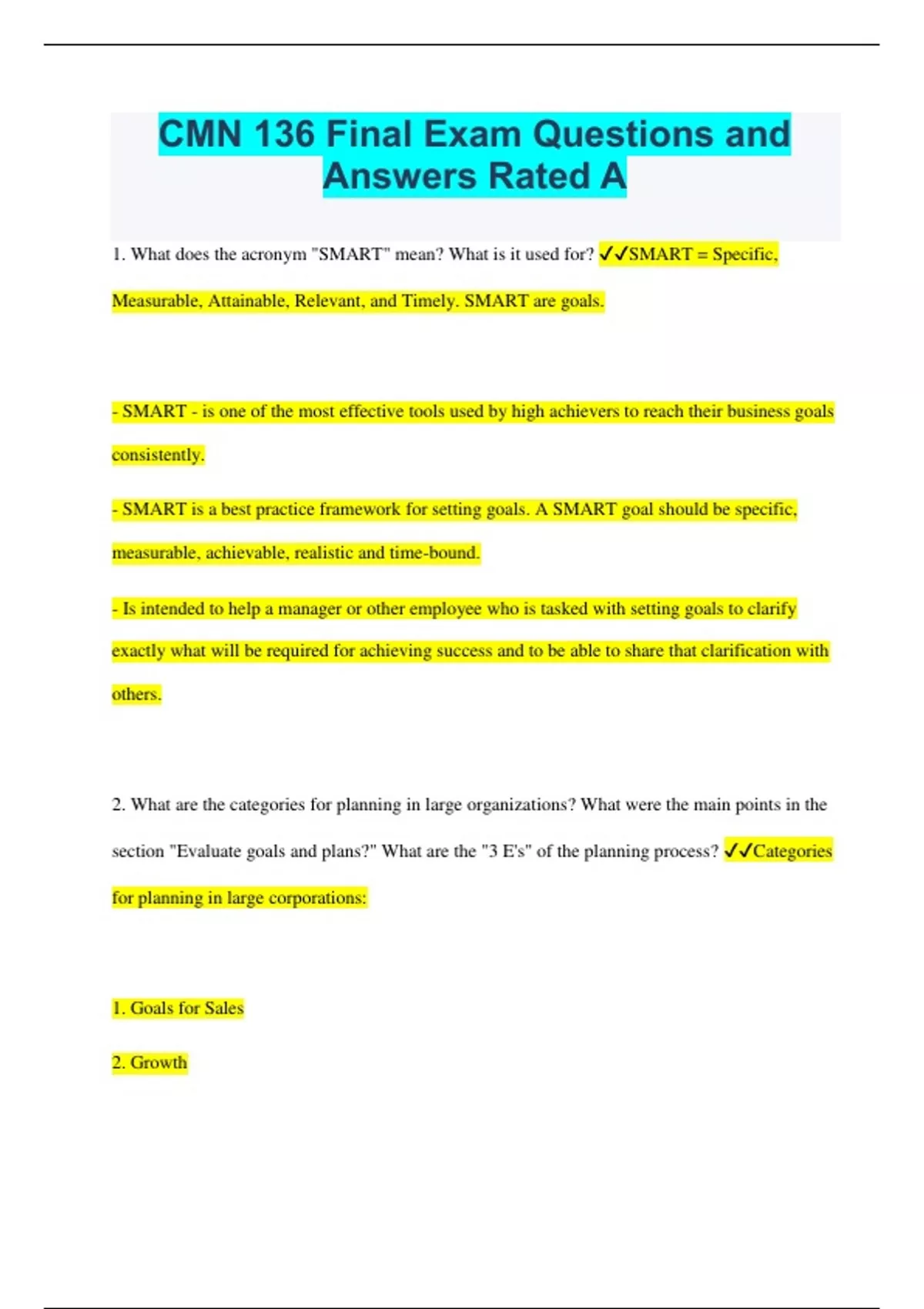 CMN 136 Final Exam Questions and Answers Rated A 1. What does the acronym "SMART" mean? What is it used for? SMART = Specific, Measurable, Attainable, Relevant, and Timely. SMART are goals. - SMART - is one of the most effective tools used by high achievers to reach their business goals consistently. - SMART is a best practice framework for setting goals. A SMART goal should be specific, measurable, achievable, realistic and time-bound. - Is intended to help a manager or other employee who is tasked with setting goals to clarify exactly what will be required for achieving success and to be able to share that clarification with others. 2. What are the categories for planning in large organizations? What were the main points in the section "Evaluate goals and plans?" What are the "3 E's" of the planning process? Categories for planning in large corporations: 1. Goals for Sales 2. Growth 3. Financial Strength 4. Profitability 5. Efficiency 6. Management Effectiveness Mani points in "Evaluate goals and plans" - Most individuals and organizations have multiple goals, but not of the same values. - Having too many goals, especially goals of equal value to you, is counterproductive - It is best to have just a few, less than ten. - A useful exercise for personal planning is to list 50 or 60 goals and then put them into categories such as Professional, Family, Health, Wealth, Spiritual, Travel etc. - A key element in evaluating alternative plans is to attach a cost to each alternative. - The plan is not complete until the costs and sources of funds have been clearly identified. - Once the costs and the benefits of each alternative have been determined, then some alternatives can usually be eliminated from further consideration. - The challenge is to select alternative plans that are in lin 3. What are the three scenarios planners consider? The three scenarios planners consider: 1. Optimistic - assumes the general economy will be robust and sales will be at the highest estimated levels and expenses will be at the lowest. 2. Pessimistic - the opposite of the optimistic, 3. Most Likely - will the organization survive, 4. Know what is said under "Implement goals and plans Implement goals and plans: - Business leaders also have to be implementers. - Making the proper decision is not enough. - You have to put ideas in actions. - In most situations, the key element to successful implementation of a plan is to properly allocate money and people. - The key document is the annual budget. A wise business manager once claimed, "If your budget for next year is the same as it was for the last year, then your plan for next year is to do what you did last year." - The other key element is people. Most major changes involve having people perform different tasks. - Workers are typically moved from one department to another as plans dictate. - Job descriptions may need to be rewritten - People may have to report to a new boss - Expectations for raises and promotions may have to change to reflect the new corporate goals. - The concept to remember is that if you don't move money and/or people then nothing changes. 5. What are the six "basic company strategies?" What does each of them mean, and what were the example companies mentioned? The six "basic company strategies 1. Low-Cost Provider Strategy (Wal-Mart) Any business can simply lower the price they charge for their goods or services and operate on a lower gross margin. Margin is refer as the percentage applied to the difference between the cost of the good being sold and the selling price divided by the selling price. - Is the strategy of selling at a lower price and then your competitors to stimulate demand and again market share. - Wal-Mart is the one of the most successful low-cost providers