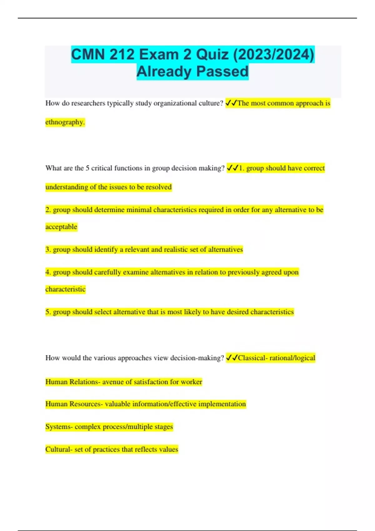 CMN 212 Exam 2 Quiz (2023/2024) Already Passed How do researchers typically study organizational culture? The most common approach is ethnography. What are the 5 critical functions in group decision making? 1. group should have correct understanding of the issues to be resolved 2. group should determine minimal characteristics required in order for any alternative to be acceptable 3. group should identify a relevant and realistic set of alternatives 4. group should carefully examine alternatives in relation to previously agreed upon characteristic 5. group should select alternative that is most likely to have desired characteristics How would the various approaches view decision-making? Classical- rational/logical Human Relations- avenue of satisfaction for worker Human Resources- valuable information/effective implementation Systems- complex process/multiple stages Cultural- set of practices that reflects values Constitutive- interactive site how the organization is constituted Critical- process where management can exert control Feminist- seen as a way to enact feminist values Within the critical approaches, what are the consequences of sequestering sexual harassment for organizations and for the women sexually harassed? Excuses: -It'll hurt the organization if you pursue a sexual harassment claim; -Deny or disguise the problem by denying that the organization condones harassment -Its just natural for men to be playful and do these things. Sequestering sexual harassment enables the organization to continue on with business as usual without having to deal with lawsuits or disciplining the harassers. For the women, it results in disempowerment and, of course, the negative effects of the sexual harassment. According to the readings, _____________ are interactional, contextual, episodic and improvisational. Select one: a. The sites of culture b. The "core" assumptions of culture c. Cultural performances d. Schein's three levels of culture C. Cultural performances According to the readings, the four key components of Deal and Kennedy's "strong cultures" are: Select one: a. Values, artifacts, heroes, and belief systems b. Values, heroes, rites/rituals, and the cultural network c. Heroes, rites/rituals, artifacts, and values d. Artifacts, values, stories, and basic assumptions B. Values, héros, rites/rituals, and the cultural network According to the lesson, which of the following is (are) function(s) that cultures perform? Select one: a. They provide a shared frame of reference b. They reduce uncertainty c. They fulfill a need for community d. All of the above e. A and B D. All of the above According to the lesson, which of the following is not an assumption of the prescriptive view of culture? Select one: a. Organizations can shape and define their cultures b. The organization should cultivate a culture that makes it more effective c. There may be multiple cultures and subcultures in an organization d. All organizations have cultures in addition to other properties, such as structure, size, complexity, etc. e. Culture influences member behavior and organizational effectiveness C. There may be multiple cultures and subcultures in an organization According to the readings, the second level of Schein's model of culture is the "core" assumptions that individuals in a group hold about the world and how it works. Select one: True False False According