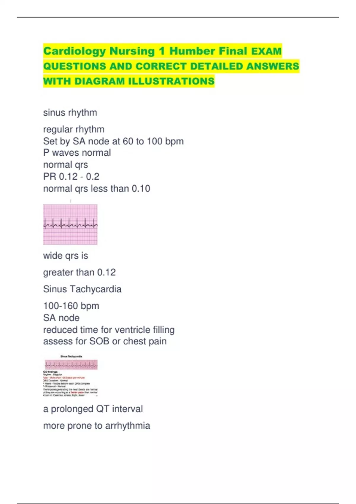Cardiology Nursing 1 Humber Final EXAM QUESTIONS AND CORRECT DETAILED ANSWERS WITH DIAGRAM ILLUSTRATIONS sinus rhythm regular rhythm Set by SA node at 60 to 100 bpm P waves normal normal qrs PR 0.12 - 0.2 normal qrs less than 0.10 wide qrs is greater than 0.12 Sinus Tachycardia 100-160 bpm SA node reduced time for ventricle filling assess for SOB or chest pain a prolonged QT interval more prone to arrhythmia NSR reflects the heart's normal electrical activity, providing synchrony between the atria and the ventricles. Sinus tachycardia occurs when the sinus node discharges impulses too fast (100 - 160 beats/minute). All other parameters are normal Facts about sinus tachycardia Normal response of heart in certain circumstances (for example exercise) •Begins and ends gradually in contrast to other tachycardias •Usually benign arrhythmia that goes away when underlying cause is treated •Common causes: Anxiety, hypoxia, hypovolemia, hypotension, heart failure, pain, drugs that increase sympathetic tone (epinephrine, norepinephrine, dopamine, dobutamine, isoproterenol, nitroprusside), and drugs that decrease parasympathetic tone (atropine)
