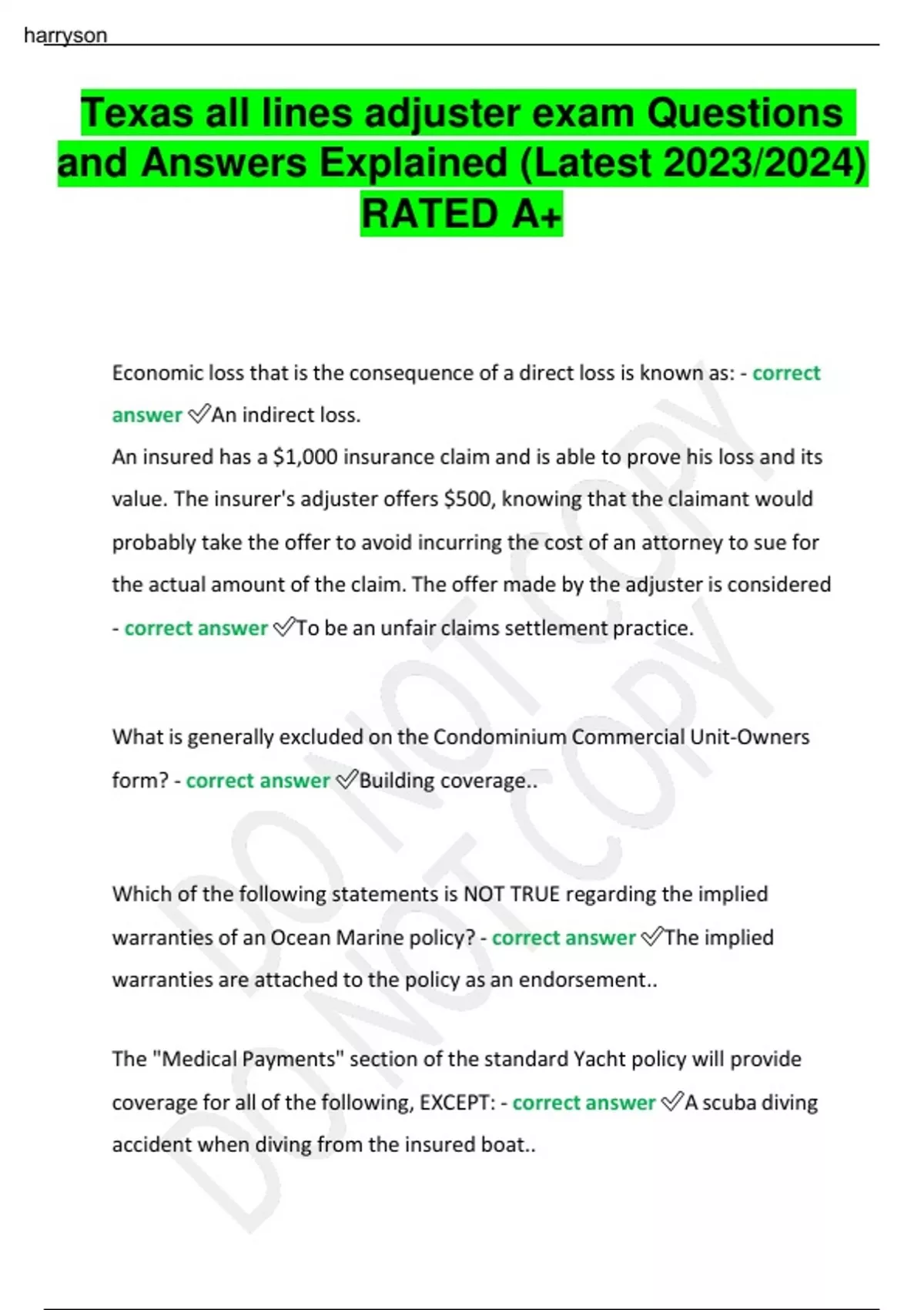Stuvia 2692837 texas all lines adjuster exam questions and answers explained latest rated a 1Texas all lines adjuster exam Questions and Answers Explained (Latest 2023/2024) RATED A+ Economic loss that is the consequence of a direct loss is known as: - correct answer An indirect loss. An insured has a $1,000 insurance claim and is able to prove his loss and its value. The insurer's adjuster offers $500, knowing that the claimant would probably take the offer to avoid incurring the cost of an attorney to sue for the actual amount of the claim. The offer made by the adjuster is considered - correct answer To be an unfair claims settlement practice. What is generally excluded on the Condominium Commercial Unit-Owners form? - correct answer Building coverage.. Which of the following statements is NOT TRUE regarding the implied warranties of an Ocean Marine policy? - correct answer The implied warranties are attached to the policy as an endorsement.. The "Medical Payments" section of the standard Yacht policy will provide coverage for all of the following, EXCEPT: - correct answer A scuba diving accident when diving from the insured boat.. harryson Texas all lines adjuster exam Questions and Answers Explained (Latest 2023/2024) RATED A+ Which of the following endorsements must be attached to a standard Businessowners policy for coverage to apply to a businesses freezer that was damaged by the interruption of a power source - correct answer Utility Services - Direct Damage endorsement. After completing an inspection of an insured's pressure equipment and fire suppression systems, the inspector determines that the pressure equipment needs to be repaired and the suppression systems have not been cleaned and inspected in the time frame required by the policy. The insurer will: - correct answer Suspend coverage immediately by red tagging the items until they are repaired, cleaned and pass reinspection To be eligible for coverage under a standardized Dwelling policy, the insured must not allow more than boarders to live on the premises. - correct answer 5 All of the following are "Perils of the Sea" under an Ocean Marine policy, EXCEPT: - correct answer Pirates Texas all lines adjuster exam Questions and Answers Explained (Latest 2023/2024) RATED A+ harryson Texas all lines adjuster exam Questions and Answers Explained (Latest 2023/2024) RATED A+ The amount of insurance countersigned, issued, or sold by an agent or producer to cover immediate family members, an employer, or employees is known as: - correct answer Controlled business Which of the following standardized Dwelling insurance forms provides coverage for loss of rental income - correct answer The DP-1, DP-2, and DP-3 forms All of the following are criteria for an accident to have occurred "in the course of" the employment under a workers' compensation policy, EXCEPT: - correct answer While performing a task that a fellow worker requested, that was unusual to the employee's job description, but occurred on the employer's premises during working hours. Parmelia is covered under two separate standardized Personal Automobile policies, with Part C limits under both policies set at $200,000. Parmelia is involved in an accident with an uninsured motorist and she sustains bodily Texas all lines adjuster exam Questions and Answers Explained (Latest 2023/2024) RATED A+