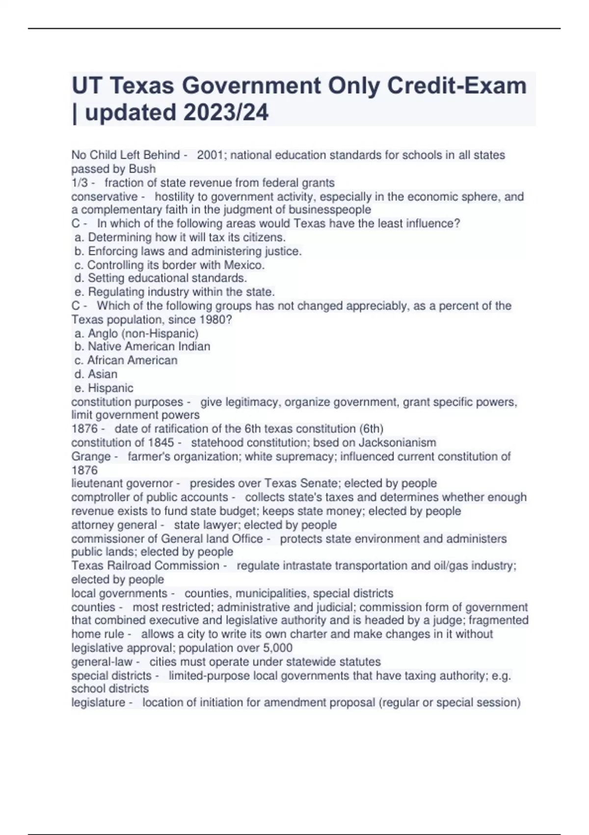 UT Texas Government Only Credit-Exam | updated 2023/24