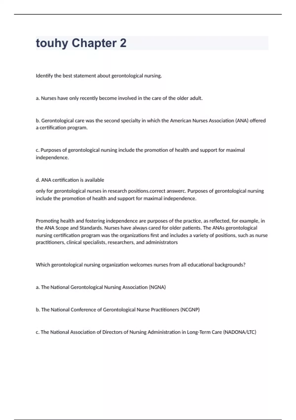 touhy Chapter 2 exam with correct answers