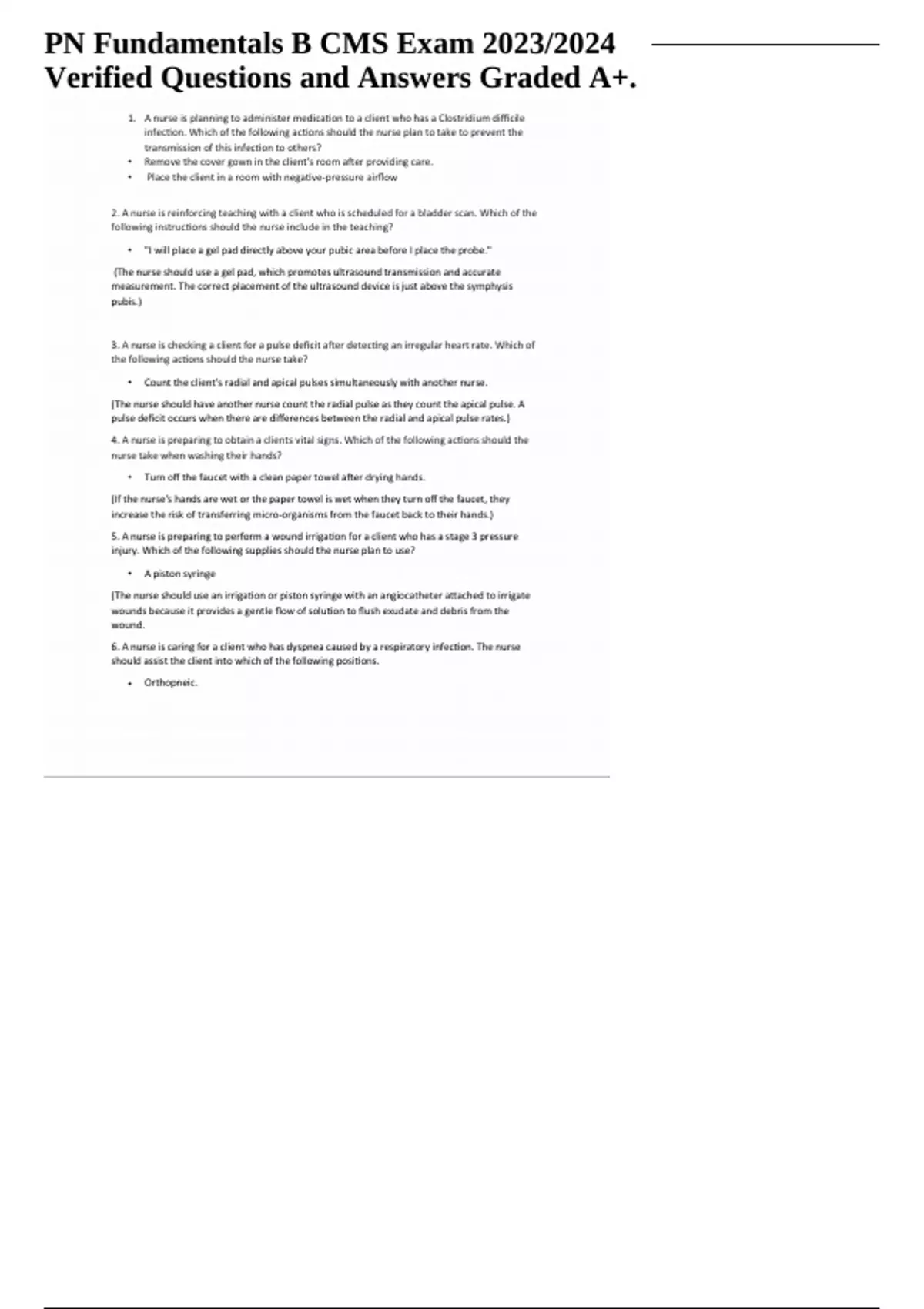 PN Fundamentals B CMS Exam 2023/2024 Verified Questions and Answers Graded A+. 1. A nurse is planning to administer medication to a client who has a Clostridium difficile infection. Which of the following actions should the nurse plan to take to prevent the transmission of this infection to others? • Remove the cover gown in the client's room after providing care. • Place the client in a room with negative-pressure airflow 2. A nurse is reinforcing teaching with a client who is scheduled for a bladder scan. Which of the following instructions should the nurse include in the teaching? • "I will place a gel pad directly above your pubic area before I place the probe." (The nurse should use a gel pad, which promotes ultrasound transmission and accurate measurement. The correct placement of the ultrasound device is just above the symphysis pubis.) 3. A nurse is checking a client for a pulse deficit after detecting an irregular heart rate. Which of the following actions should the nurse take? • Count the client's radial and apical pulses simultaneously with another nurse. (The nurse should have another nurse count the radial pulse as they count the apical pulse. A pulse deficit occurs when there are differences between the radial and apical pulse rates.) 4. A nurse is preparing to obtain a clients vital signs. Which of the following actions should the nurse take when washing their hands? • Turn off the faucet with a clean paper towel after drying hands. (If the nurse's hands are wet or the paper towel is wet when they turn off the faucet, they increase the risk of transferring micro-organisms from the faucet back to their hands.) 5. A nurse is preparing to perform a wound irrigation for a client who has a stage 3 pressure injury. Which of the following supplies should the nurse plan to use? • A piston syringe (The nurse should use an irrigation or piston syringe with an angiocatheter attached to irrigate wounds because it provides a gentle flow of solution to flush exudate and debris from the wound. 6. A nurse is caring for a client who has dyspnea caused by a respiratory infection. The nurse should assist the client into which of the following positions. • Orthopneic. PN Fundamentals B CMS Exam 2023/2024 Verified Questions and Answers Graded A+. (The nurse should assist the client into the orthopedic position by having the client sit upright either in bed or in a chair and lean forward. This position allows maximal chest expansion and facilitates breathing). 7. A nurse in reinforcing teaching about carbohydrate counting with a client who has a new diagnosis of diabetes mellitus. Which of the following actions should the nurse take first? • Ask the client what they already know about meal planning. (The first action the nurse should take using the nursing process is to collect data to determine the client's current level of knowledge. Then, the nurse can plan education to meet the client's needs). 8. A nurse is caring for a client who has a new prescription for oxygen at 7 L/min via simple face mask. Which of the following actions should the nurse take to ensure client safety? • Attach a humidifier to the base of the flow meter. (The nurse should attach a humidifier at the base of the flow meter to moisten the air for the client. This action will prevent dying mucous membranes when the client is receiving oxygen at a rate greater than 4 L/min). 9. A nurse is contributing to the plan of care for a client who practices Islam. Which of the following questions should the nurse ask the client to clarify the client's religious preferences • "Do you consume pork products?" (Some clients who practice Islam do not consume pork or alcohol). 10. A nurse is caring for a client who has limited mobility. Which of the following actions should the nurse take to maintain the client's skin integrity? • Use warm water when bathing the client. (The nurse should use warm water to bathe the client because hot water can dry and damage the skin). 11. A nurse is caring for four clients. For which of the following clients should the nurse use the therapeutic communication technique of silence? • A client who has just experienced the death of their child. (Silence is a therapeutic communication technique to use when a client is grieving. It demonstrates caring and patience and allows the client to speak when they are ready to do so). 12. A nurse is caring for a group of clients in a long-term care facility. Which of the following actions should the nurse take to prevent health care-associated infections for these clients? (Select all that apply) • Wash hands after removing gloves. (The nurse should perform hand hygiene after removing gloves to prevent the transmission of micro-organisms from one setting or client to another). • Use antimicrobial hand gel after refilling a client's water pitcher (The nurse should perform hand hygiene after touching a client's supplies to prevent the transmission of micro-organisms). • Clean the stethoscope with an antimicrobial wipe after obtaining vital signs. (The nurse should wipe all equipment used for multiple clients with an antimicrobial wipe to prevent the transmission of micro-organisms from one client to another). 13. A nurse is caring for a client who has been vomiting and has diarrhea. Which of the following findings should the nurse identify as an indication of fluid volume deficit? • A thready pulse. ( A client who has fluid volume deficit will have thready peripheral pulses). 14. A nurse is planning care for a group of clients. The nurse should expect to witness an informed consent for a client who will undergo which of the following procedures? • Performance of a paracentesis.