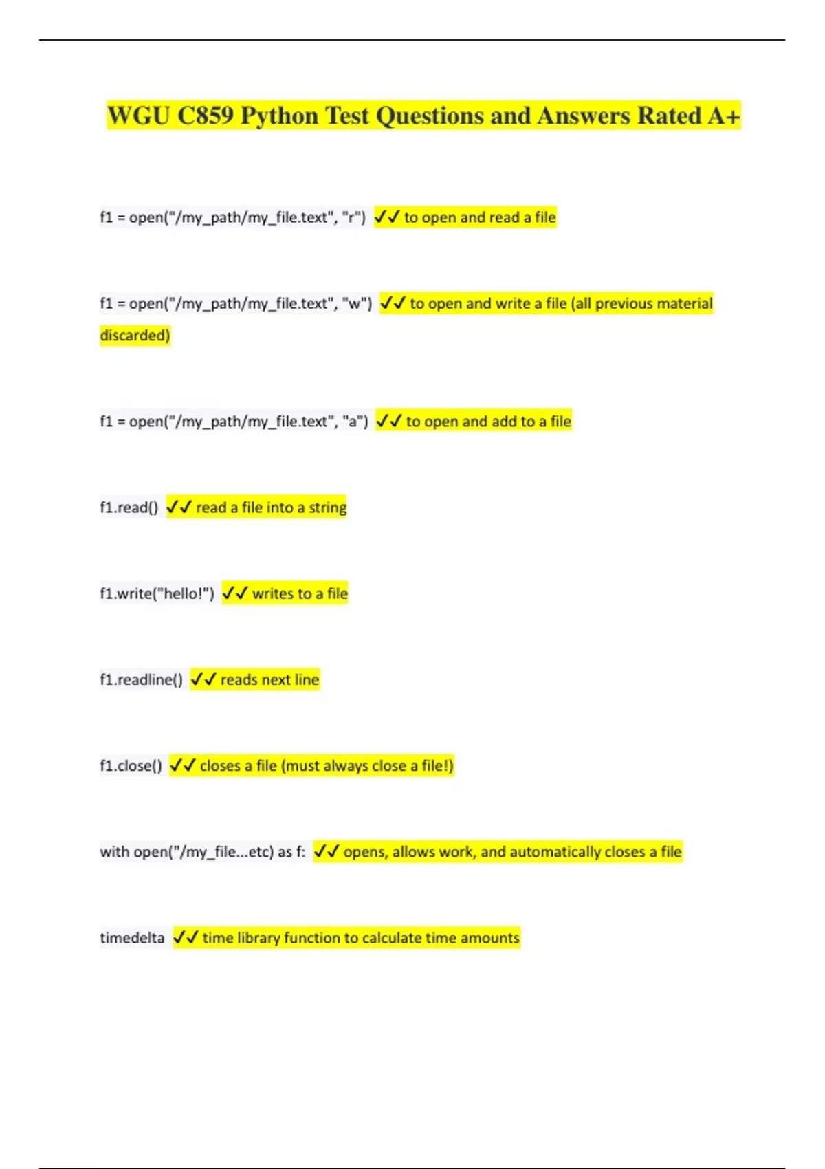 WGU C859 Python Test Questions and Answers Rated A+ f1 = open("/my_path/my_", "r") to open and read a file f1 = open("/my_path/my_", "w") to open and write a file (all previous material discarded) f1 = open("/my_path/my_", "a") to open and add to a file () read a file into a string ("hello!") writes to a file ine() reads next line () closes a file (must always close a file!) with open("/my_file...etc) as f: opens, allows work, and automatically closes a file timedelta time library function to calculate time amounts