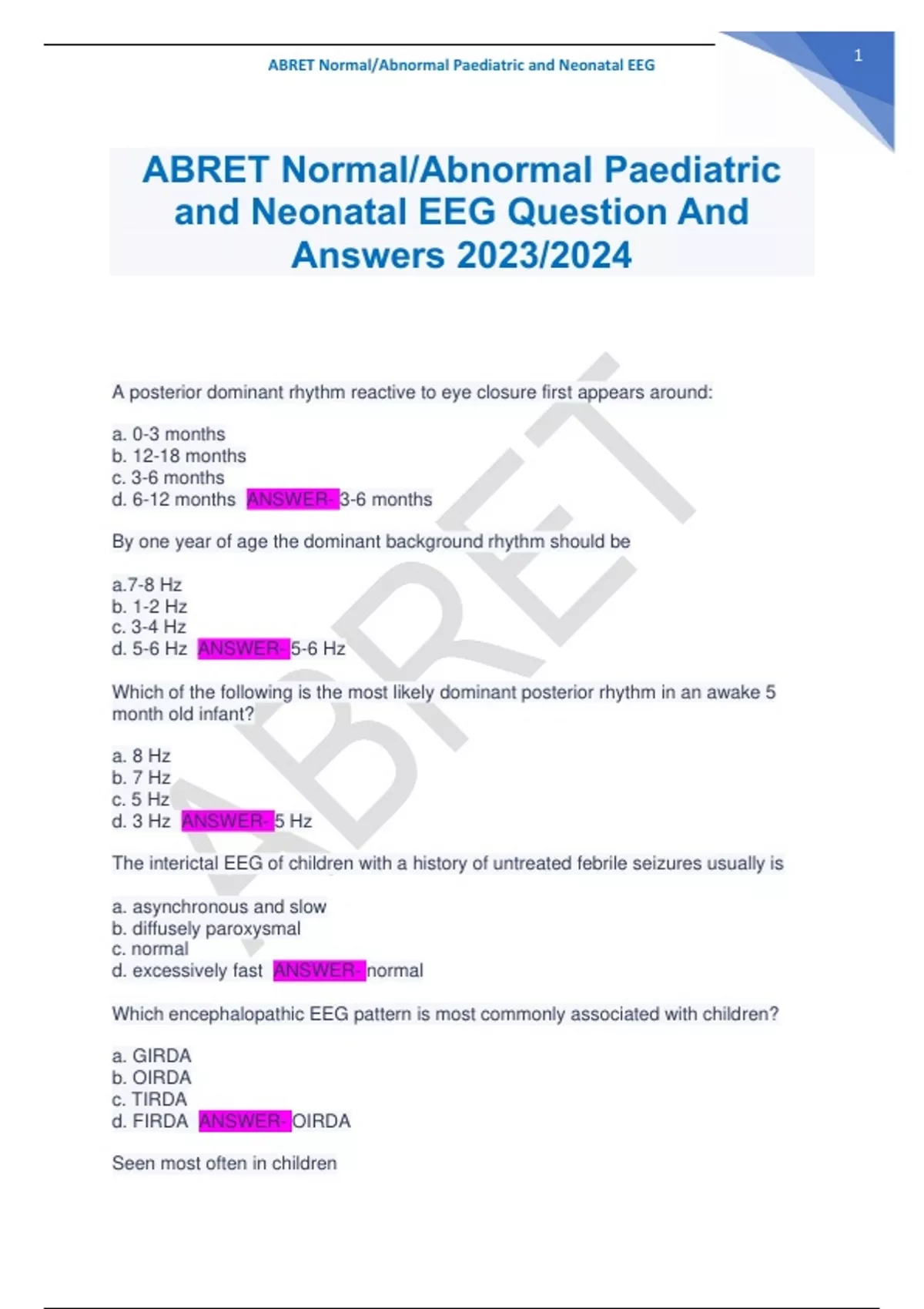 ABRET Normal/Abnormal Paediatric and Neonatal EEG Question And Answers 2023/2024
