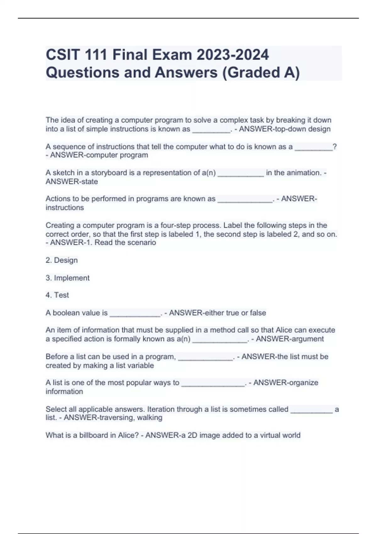 CSIT 111 Final Exam Questions and Answers (Graded A)CSIT 111 Final Exam Questions and Answers (Graded A)CSIT 111 Final Exam Questions and Answers (Graded A)CSIT 111 Final Exam Questions and Answers (Graded A)The idea of creating a computer program to solve a complex task by breaking it down into a list of simple instructions is known as _________. - ANSWER-top-down design A sequence of instructions that tell the computer what to do is known as a _________? - ANSWER-computer program A sketch in a storyboard is a representation of a(n) ___________ in the animation. - ANSWER-state Actions to be performed in programs are known as _____________. - ANSWER-instructions Creating a computer program is a four-step process. Label the following steps in the correct order, so that the first step is labeled 1, the second step is labeled 2, and so on. - ANSWER-1. Read the scenario